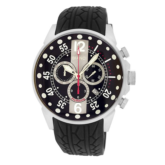 The Bianci Pro Racing collection is HOT!!! In a racing environment where every second and minute counts, this high performance watch will exceed all expectations. The masterfully designed timepiece features an all brushed stainless steel case, Swiss chronograph movement with date, sapphire coated antireflective crystal, textured dial with luminous hands and hour markers, rubber band with steel buckle, and push/pull crown. This affordable designer watch is 10 ATM water resistant and includes a three year manufacturer's warranty.