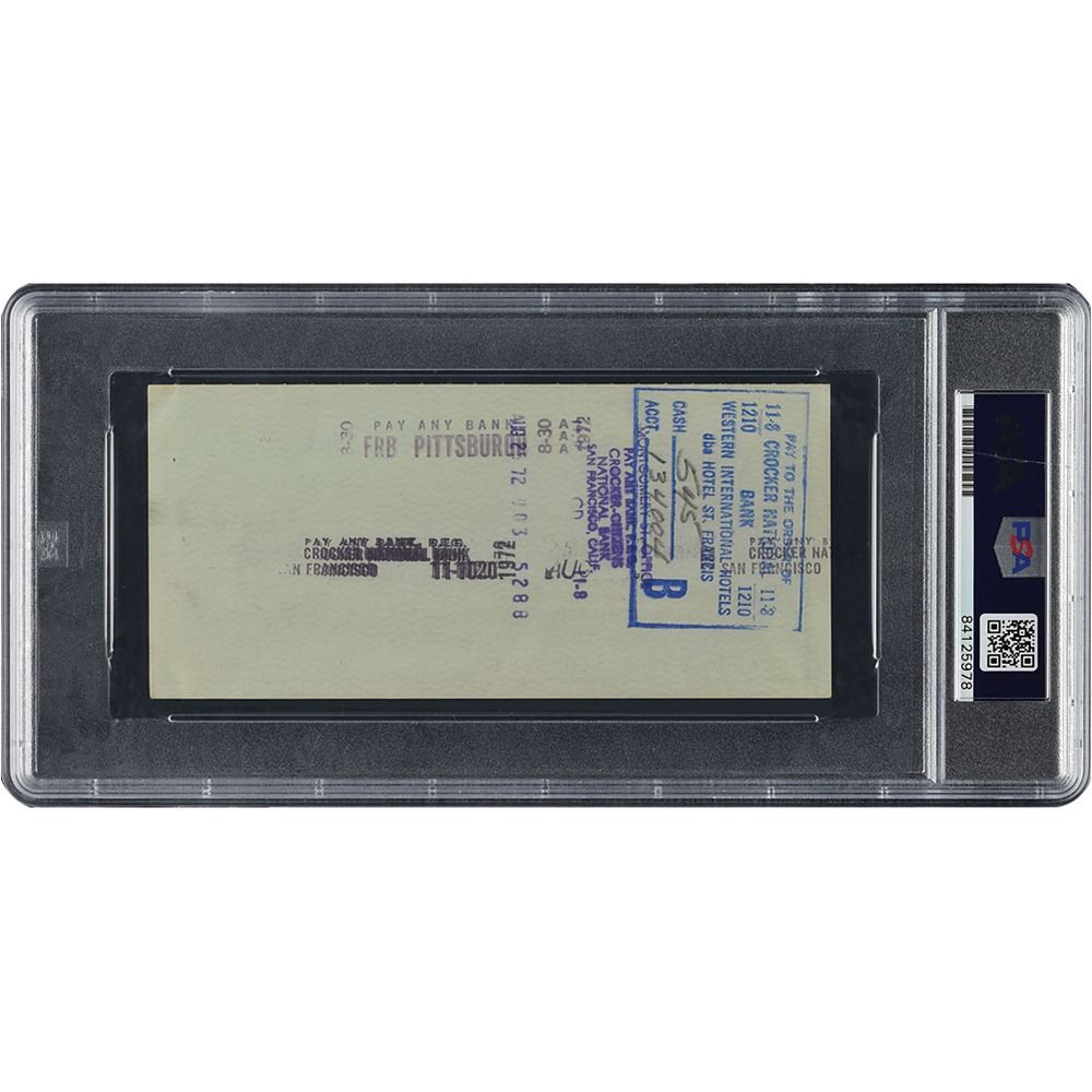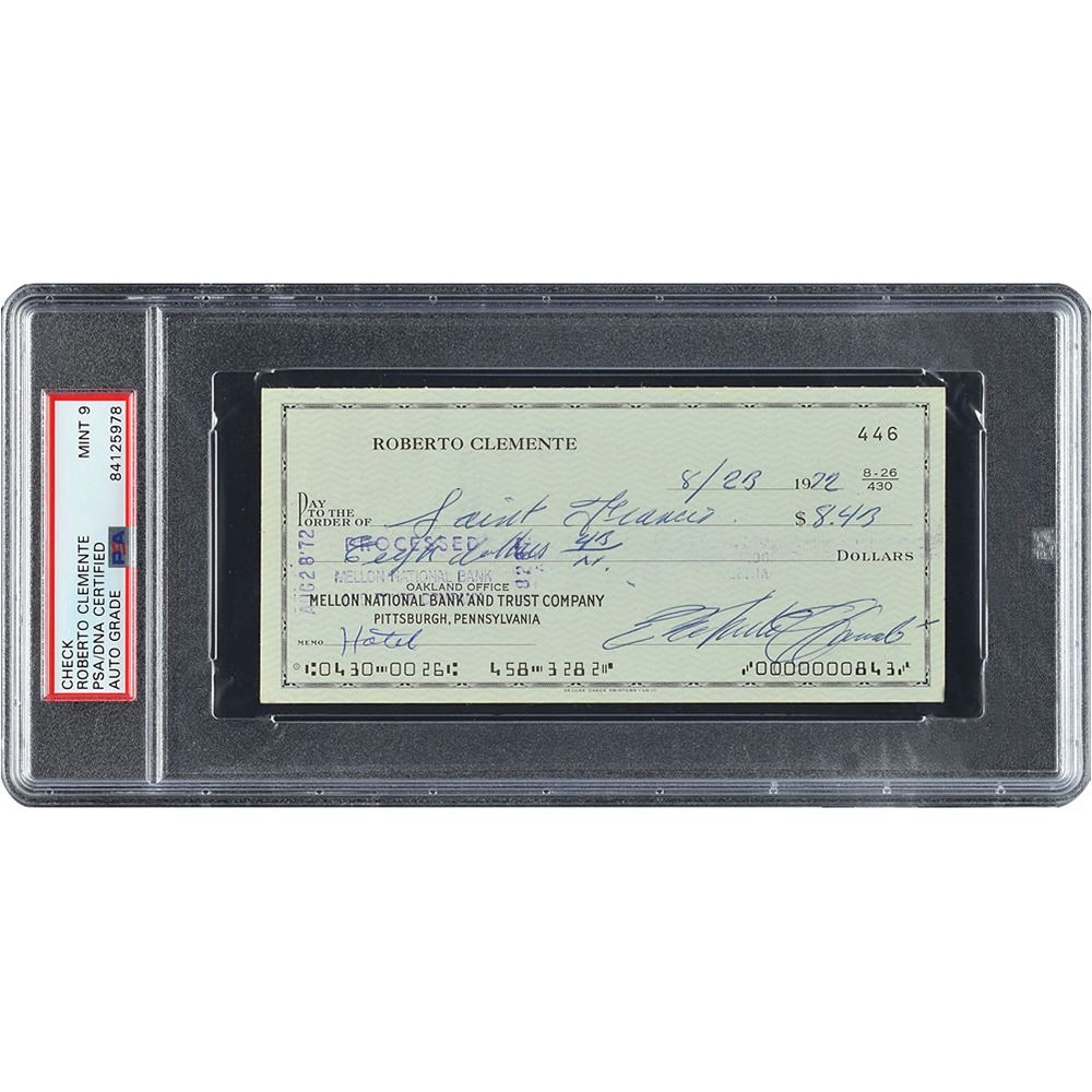 Personal check, 6 x 2.75, filled out and signed in blue ink by Clemente, "Roberto Clemente," payable to Saint Francis for $8.43, August 23, 1972. In Near Mint overall condition. On August 23rd the Pirates were in San Francisco to wrap up a three game series; Clemente, who had been injured for much of the month, went 0-4 in a shutout loss. Clemente is sought-after in personal checks, and this example dates to his final season—just months before he died in a tragic plane crash while en route to deliver humanitarian aid to Nicaragua. Encapsulated by PSA/DNA, with the signature graded MINT 9.