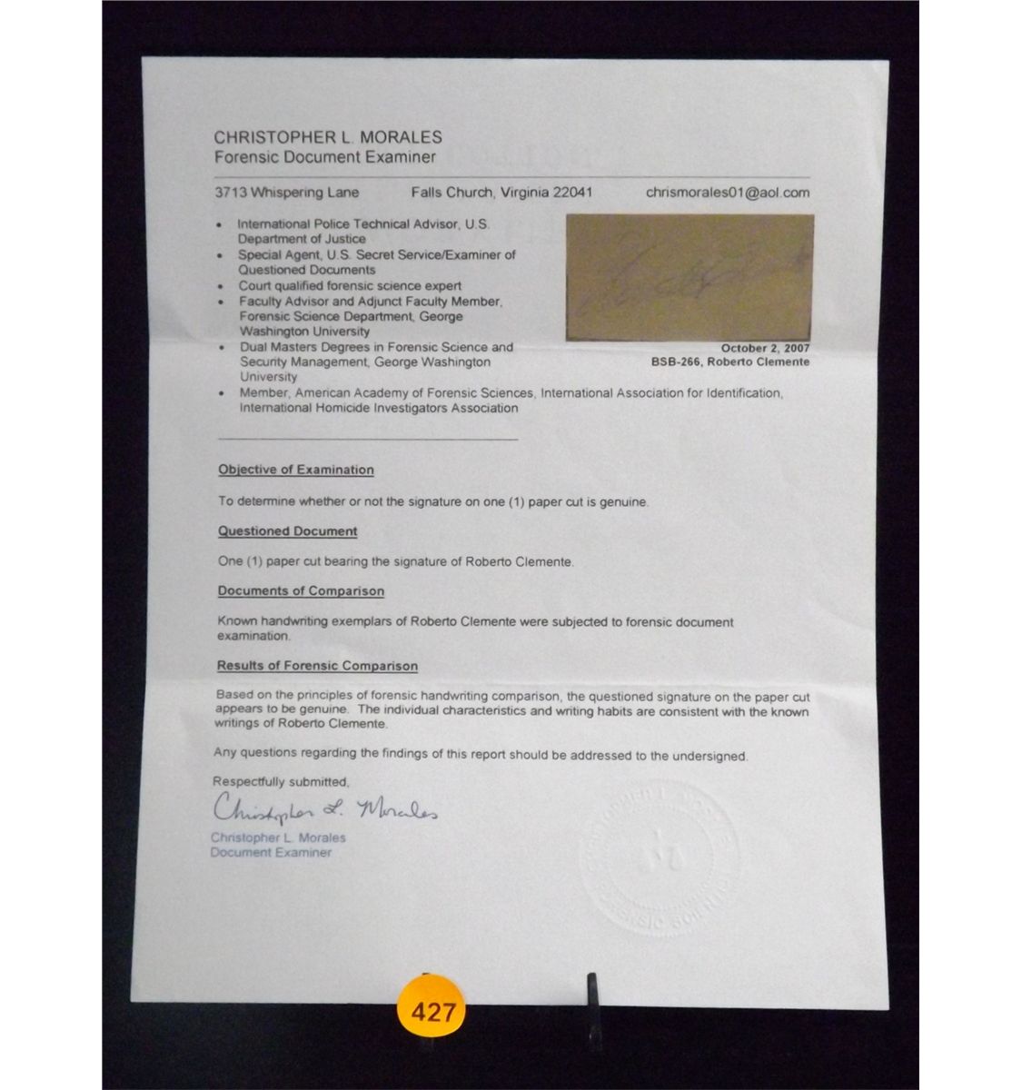 Roberto Clemente Autographed Paper. Die-Cut Paper Bearing Signature of Roberto Clemente. Appraised or estimated retail value $1300. COA by Christopher Morales. All Sales Final. Please see terms and conditions of auction.