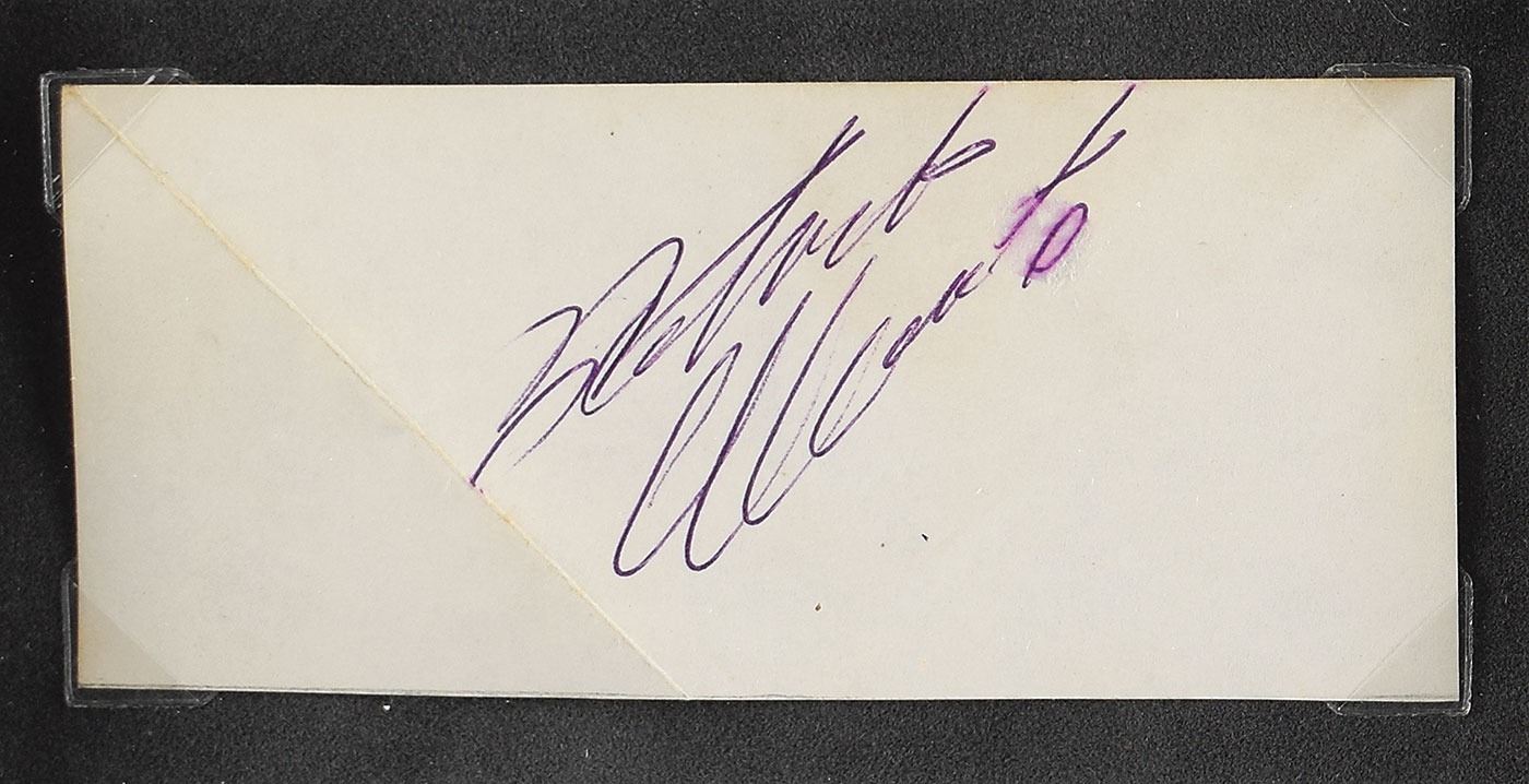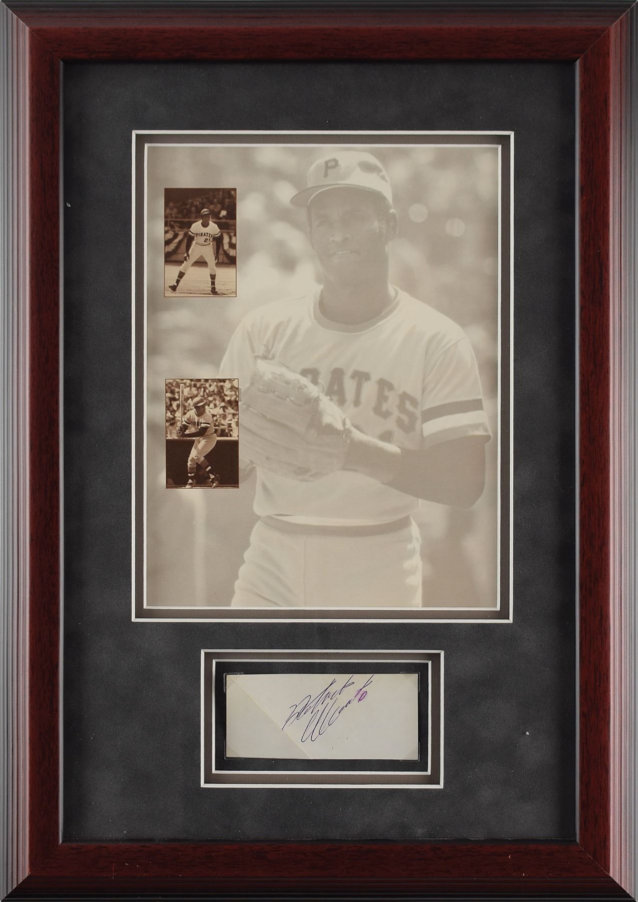 Purple ballpoint signature, "Roberto Clemente,” on an off-white 4.25 x 2 sheet. Matted and framed with a photo collage of the Pirates legend to an overall size of 14.5 x 20.5. In very good to fine condition, with two diagonal creases, and light smudging to the last two letters of the signature. Accompanied by a full letter of authenticity from PSA/DNA.