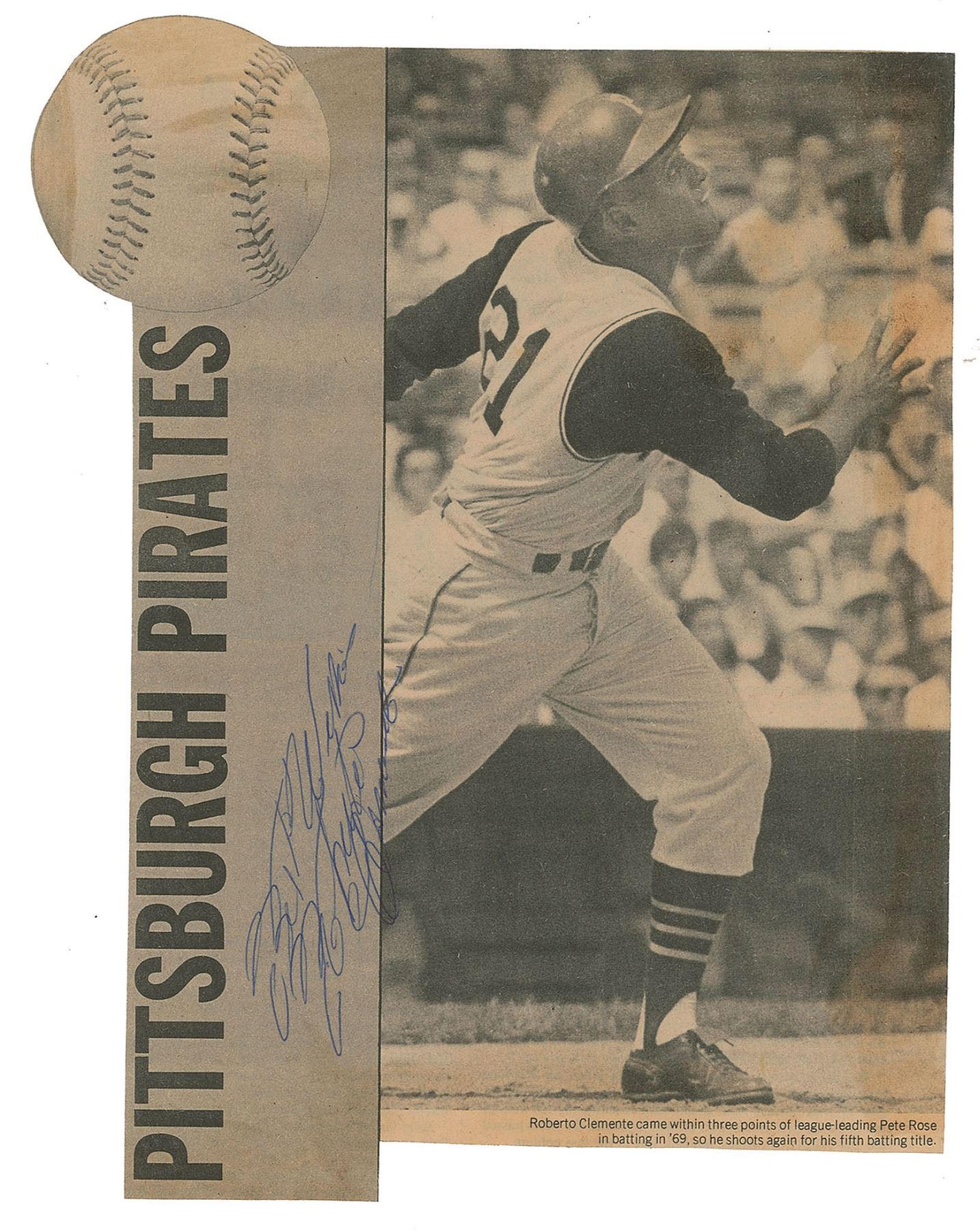 Fantastic 7.75 x 9.75 newspaper photo of Clemente in a heroic post-swing pose, showing the famed Pittsburgh Pirate admiring an outfield blast, signed in blue ballpoint, "Best wishes, Roberto Clemente." In fine condition, with scattered light staining.
