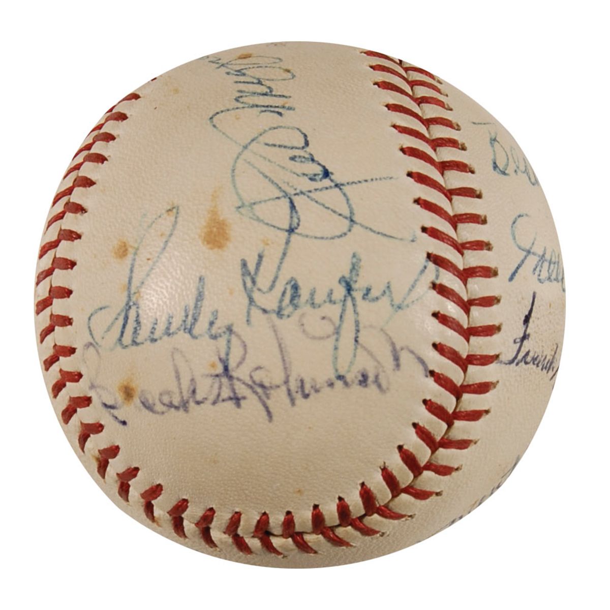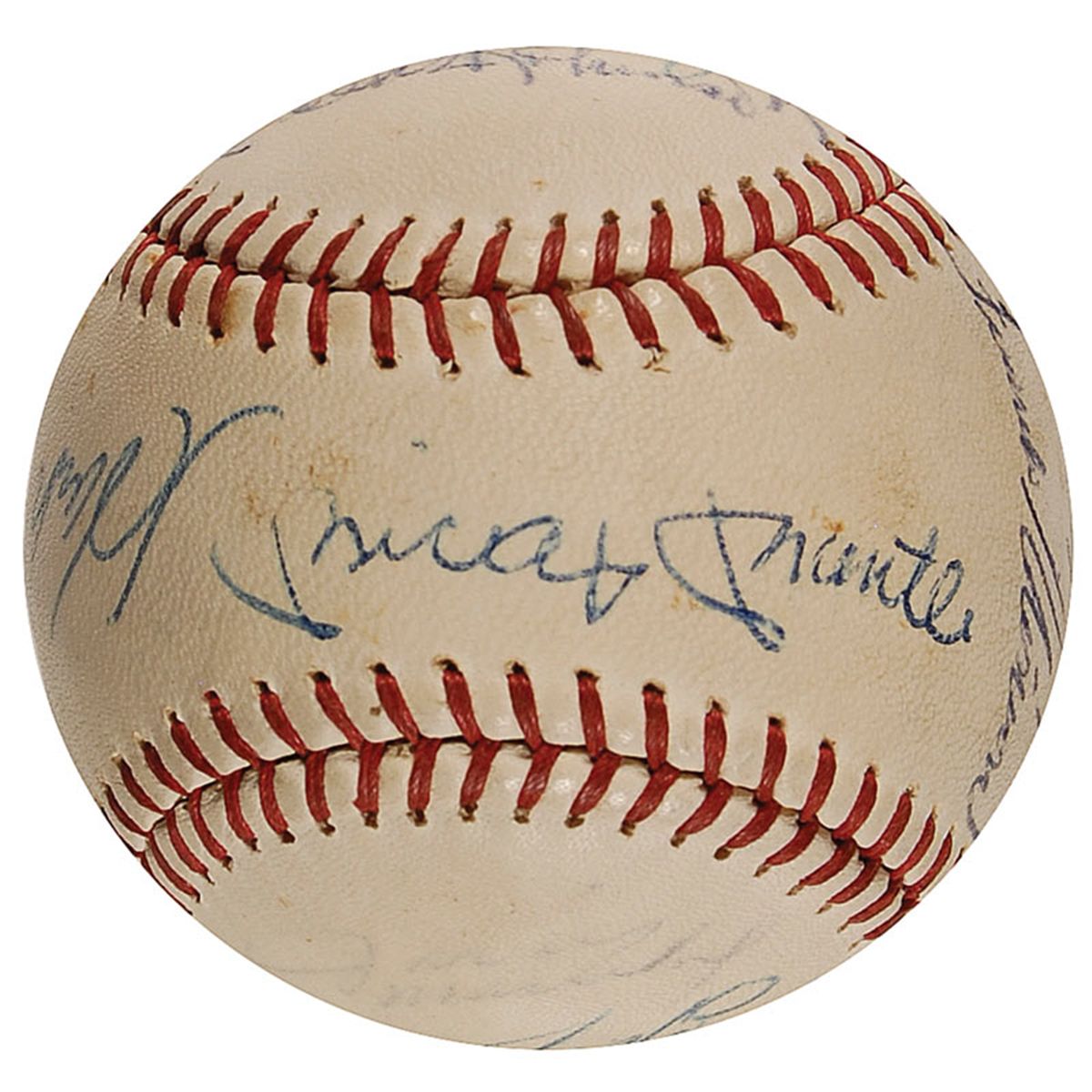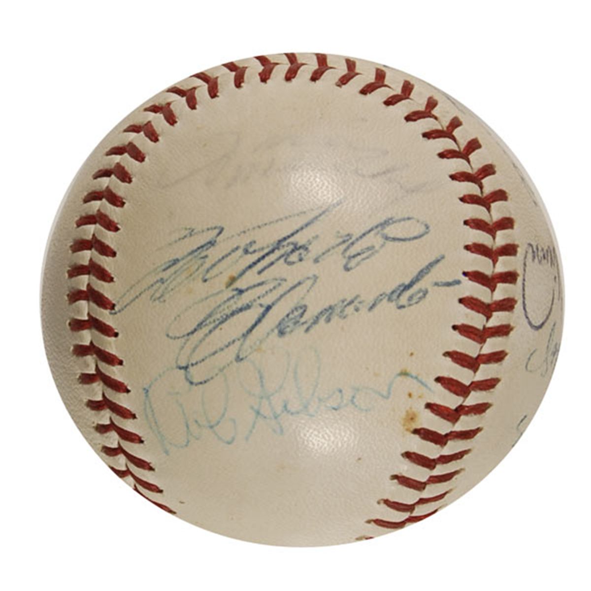 Official Spalding National League baseball signed in blue ballpoint by 11 baseball legends. Signers are: Roberto Clemente, Mickey Mantle (ss), Hank Aaron, Frank Robinson, Willie Mays, Joe DiMaggio, Sandy Koufax, Brooks Robinson, Bob Gibson, and Juan Marichal. Uniform toning, scattered soiling and spotting, Marichal’s signature very light, but still mostly legible, and some light brushes to a couple of signatures, otherwise fine condition. A truly amazing assemblage of legends.