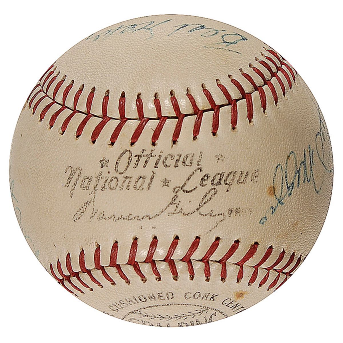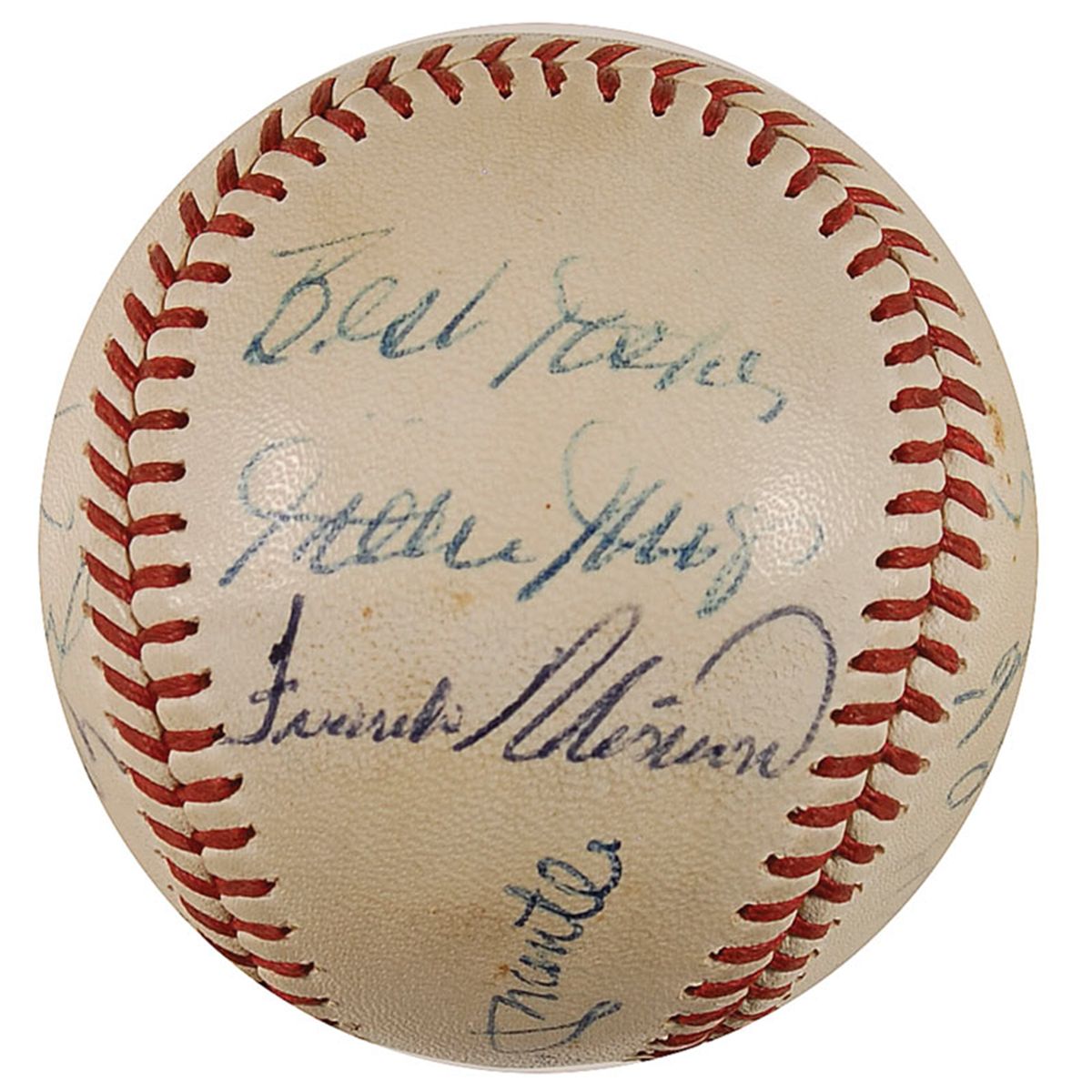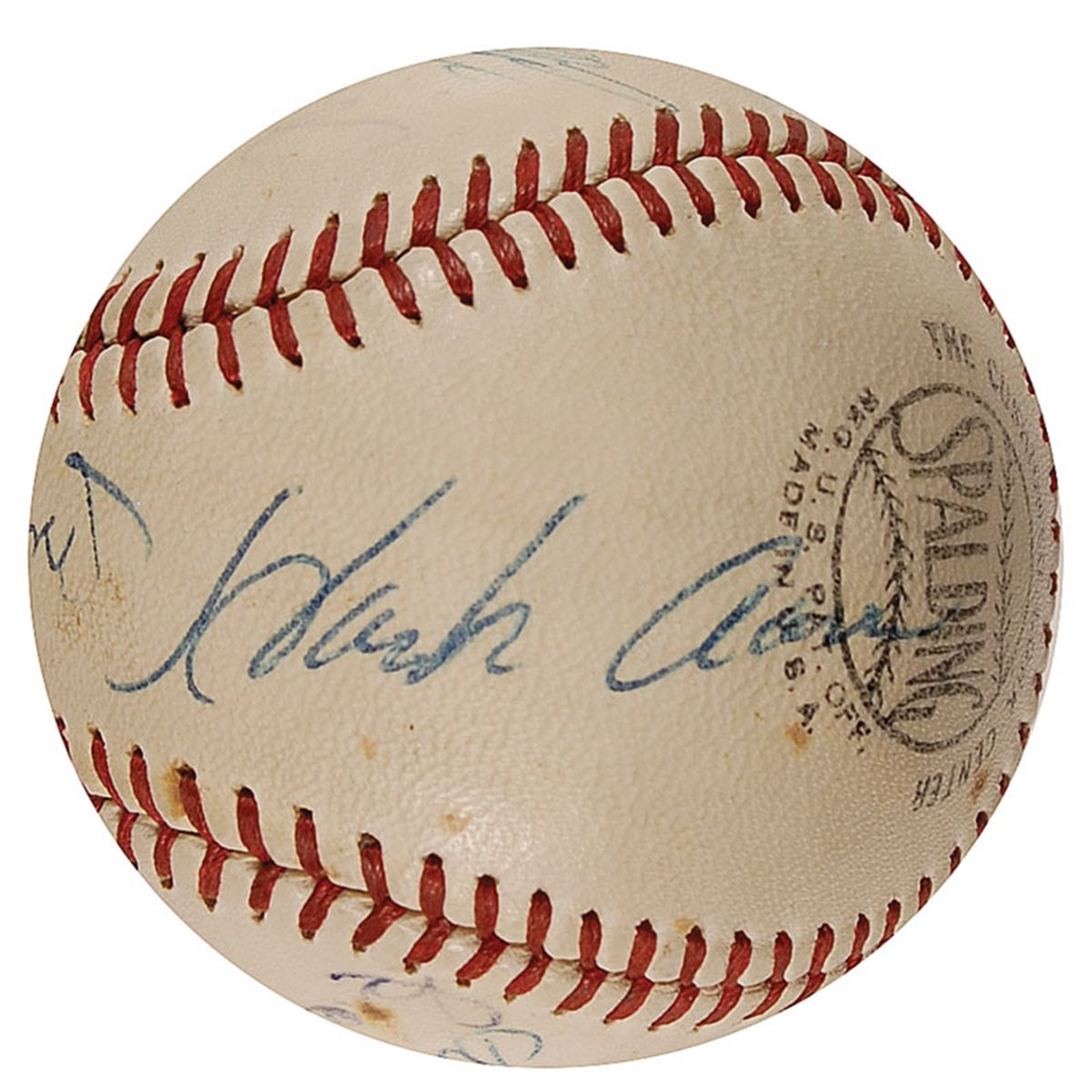 Official Spalding National League baseball signed in blue ballpoint by 11 baseball legends. Signers are: Roberto Clemente, Mickey Mantle (ss), Hank Aaron, Frank Robinson, Willie Mays, Joe DiMaggio, Sandy Koufax, Brooks Robinson, Bob Gibson, and Juan Marichal. Uniform toning, scattered soiling and spotting, Marichal’s signature very light, but still mostly legible, and some light brushes to a couple of signatures, otherwise fine condition. A truly amazing assemblage of legends.