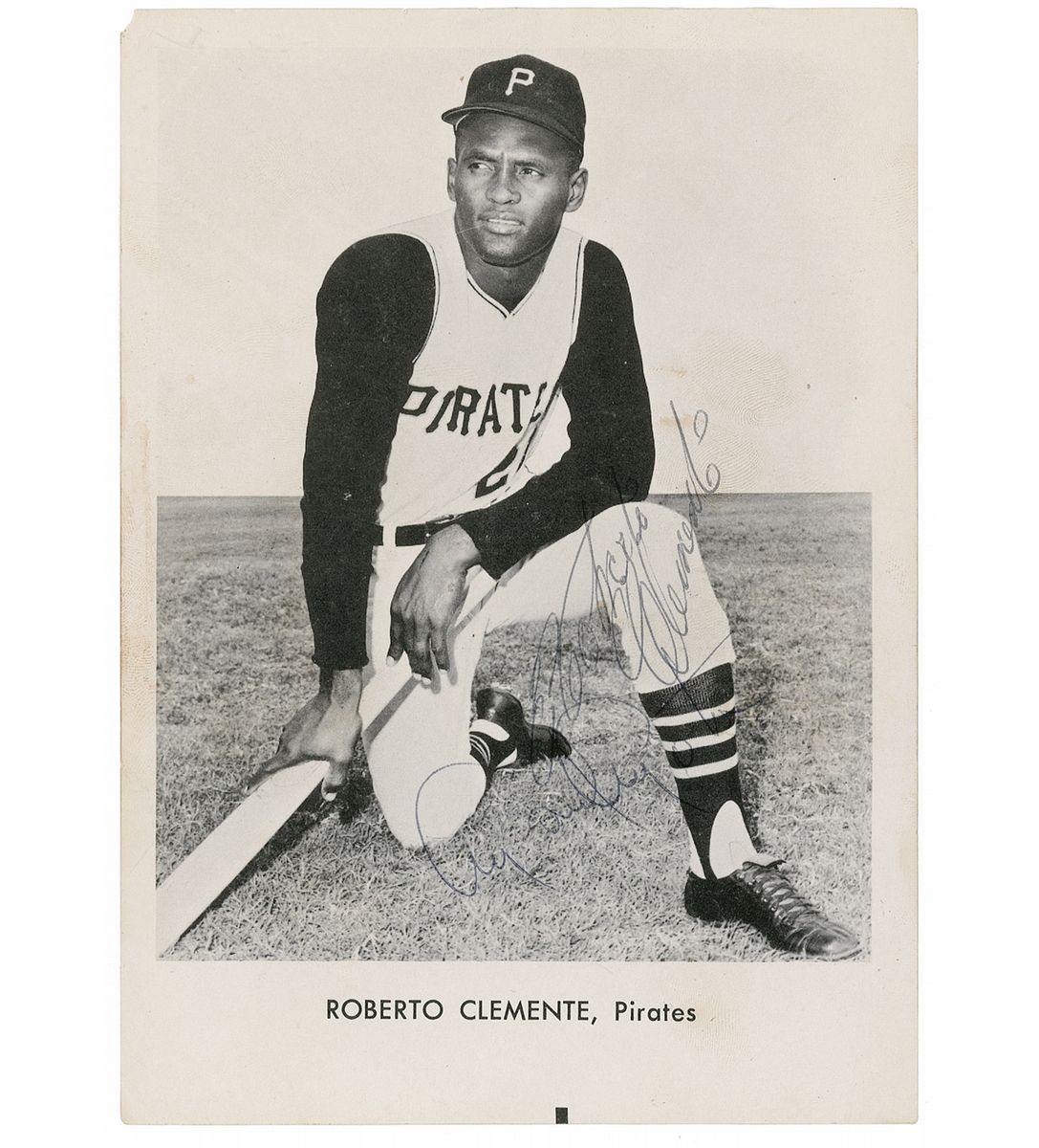 Vintage 5 x 7 team-issued Pittsburgh Pirates paperstock photo, signed vertically in black ballpoint. In very good condition, with scattered creases, some light toning and soiling, mainly to edges, and an unidentified signature below Clemente’s.
