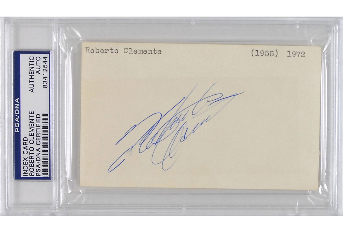 Vintage ballpoint signature, “Roberto Clemente,” on an off-white 5 x 3 card with typed collector’s notations along the top edge. Encapsulated in a plastic PSA/DNA authentication holder. In fine condition, with a faint block of mild toning over signature from previous display.