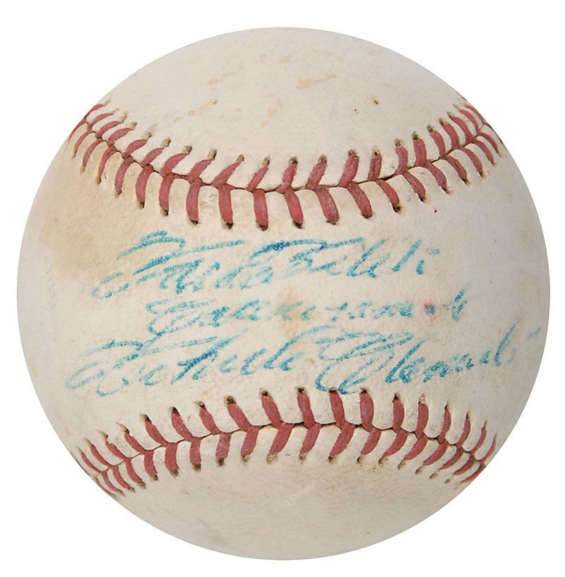 Official MacGregor baseball signed in blue ballpoint on the sweet spot with an inscription or salutation added above. In very good condition, with light overall wear and scuffing, scattered toning, maker stamps a bit faded, and some indications of signature removal. Accompanied by a full letter of authenticity from JSA.