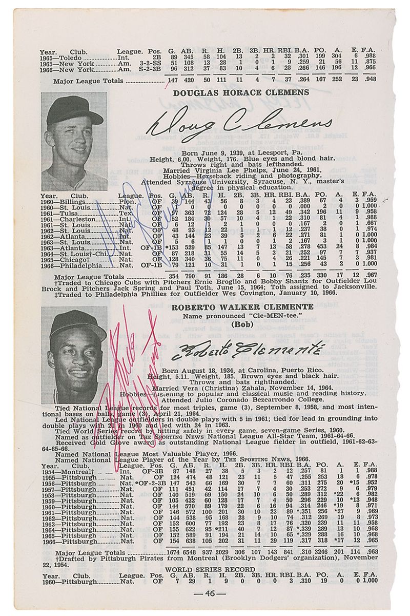 Vintage book page removed from a 1967 encyclopedia of baseball statistics, 5.5 x 9, signed in red ballpoint by Clemente next to his image and biographical information. Also signed by Doug Clemens above and Horace Clarke on the reverse. In fine condition.