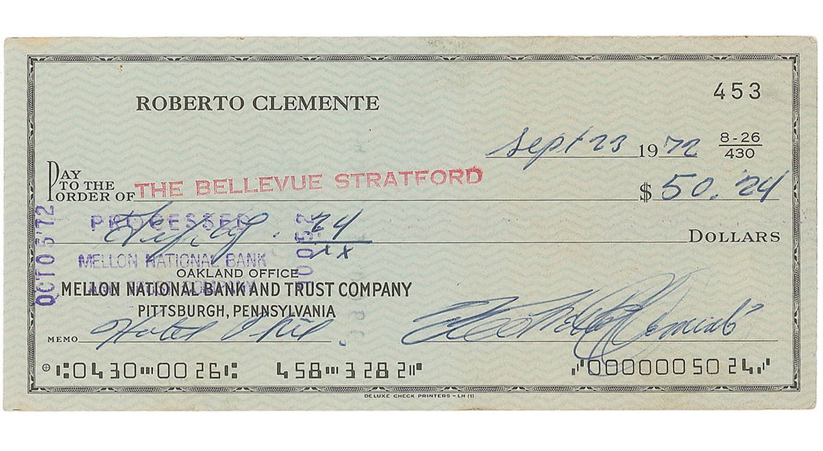 Choice personal check, 6 x 2.75, filled out and signed by Clemente, “Roberto Clemente,” payable to The Bellevue Stratford for $50.24, September 23, 1972. In fine condition. This dates to exactly one week before Clemente obtained his 3,000th hit, which came in a game against the Mets at Three Rivers Stadium on September 30. An immensely desirable piece from the Hall of Famer’s final season.