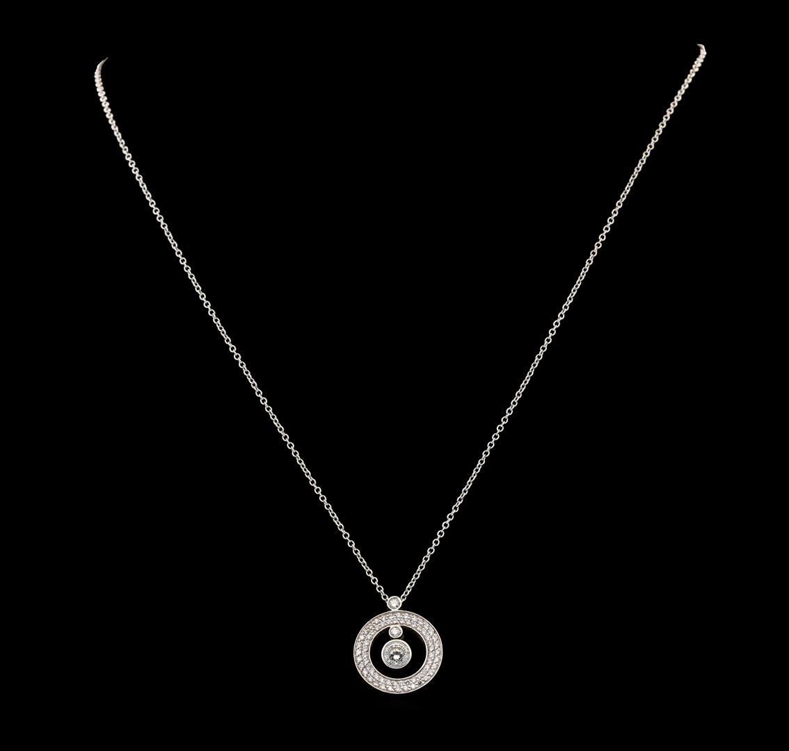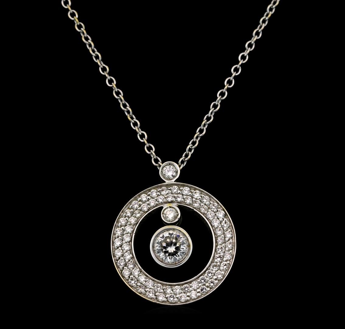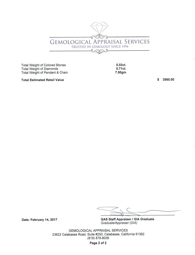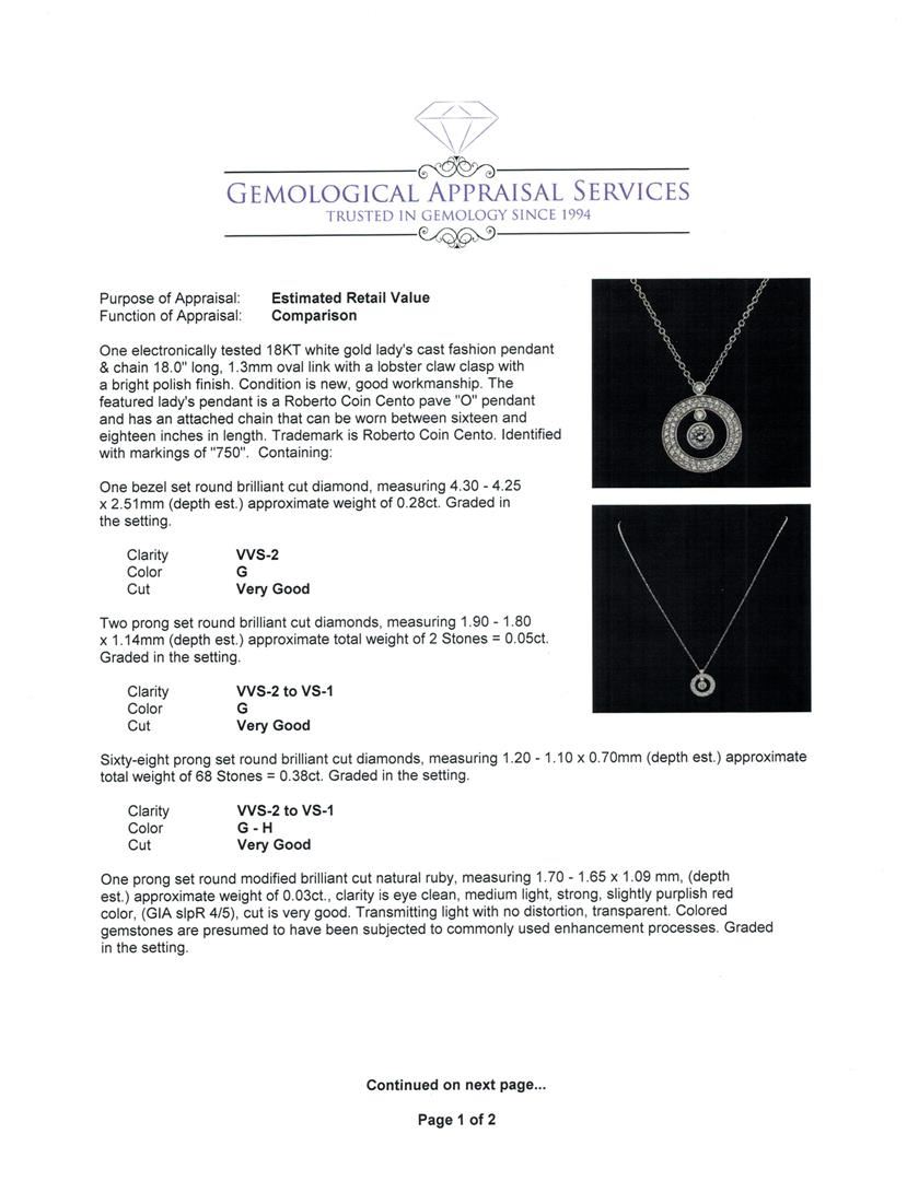 One electronically tested 18KT white gold lady's cast fashion pendant & chain 18.0' long, 1.3mm oval link with a lobster claw clasp with a bright polish finish. The featured lady's pendant is a Roberto Coin Cento pave 'O' pendant and has an attached chain that can be worn between sixteen and eighteen inches in length. Trademark is Roberto Coin Cento. Identified with markings of '750'. Condition is new, good workmanship. Containing: One bezel set round brilliant cut diamond, measuring 4.30 - 4.25 x 2.51mm (depth est.) approximate weight of 0.28ct. Graded in the setting. Clarity VVS-2. Color: G Cut Very Good Two prong set round brilliant cut diamonds, measuring 1.90 - 1.80 x 1.14mm (depth est.) approximate total weight of 2 Stones = 0.05ct. Graded in the setting. Clarity VVS-2 to VS-1. Color: G Cut Very Good Sixty-Eight prong set round brilliant cut diamonds, measuring 1.20 - 1.10 x 0.70mm (depth est.) approximate total weight of 68 Stones = 0.38ct. Graded in the setting. Clarity VVS-2 to VS-1. Color: G - H Cut Very Good One prong set round modified brilliant cut natural ruby, measuring 1.70 - 1.65 x 1.09 mm, (depth est.) approximate weight of 0.03ct., clarity is eye clean, medium light, strong, slightly purplish red color, (GIA slpR 4/5), cut is very good. Transmitting light with no distortion, transparent. Colored gemstones are presumed to have been subjected to commonly used enhancement processes. Graded in the setting. Total Weight of Colored Stones 0.03ct.. Total Weight of Diamonds 0.71ct.. Total Weight of Pendant & Chain 7.50gm. GAS Appraised at $3,560.00.