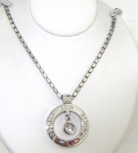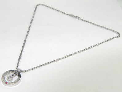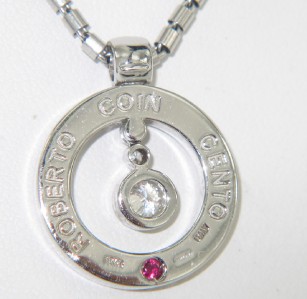 Roberto Coin 18K Gold Diamond & Ruby NecklaceThe total weight of Necklace is 16.5 grams.The total weight of diamond is 0.29 cts. approximately, G - H color VS clarity.The total weight of ruby: 0.05 pts. approximately.The measurements of the Pendant: 22 x 18 mm and 2 mm in thickness.The Necklace is 16" long.