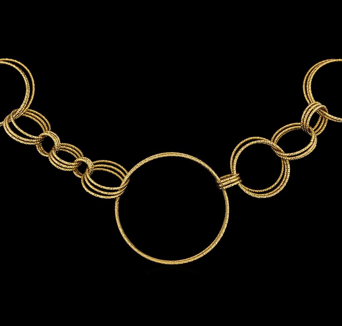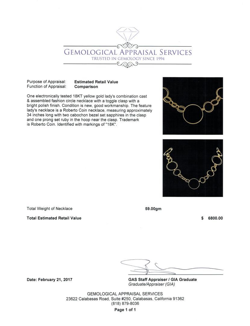 One electronically tested 18KT yellow gold lady's combination cast & assembled fashion circle necklace with a toggle clasp with a bright polish finish. The feature lady's necklace is a Roberto Coin necklace, measuring approximately 34 inches long with two cabochon bezel set sapphires in the clasp and one prong set ruby in the hoop near the clasp. Trademark is Roberto Coin. Identified with markings of '18K'. Condition is new, good workmanship.. Total Weight of Necklace 59.00gm GAS Appraised at $6,800.00.
