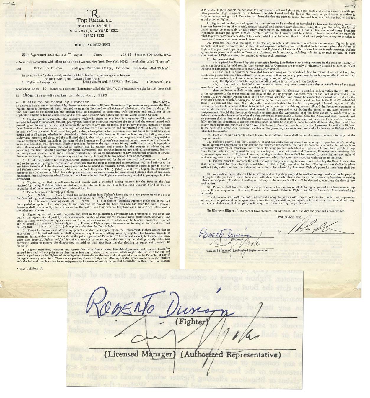 ''Top Rank'' contract signed by boxer Roberto Duran, dated 22 June 1983, for an upcoming 15-round Middleweight Championship bout between Duran and Marvin Hagler to be held in Las Vegas. Contract discusses promotional agreements and also stipulates the maximum weight at 160 pounds. Document measures 8.5'' x 14'' on two pages, front and verso, with staple holes, paperclip impression and a significant fold along bottom. Signed clearly ''Roberto Duran'' on verso. Very good.