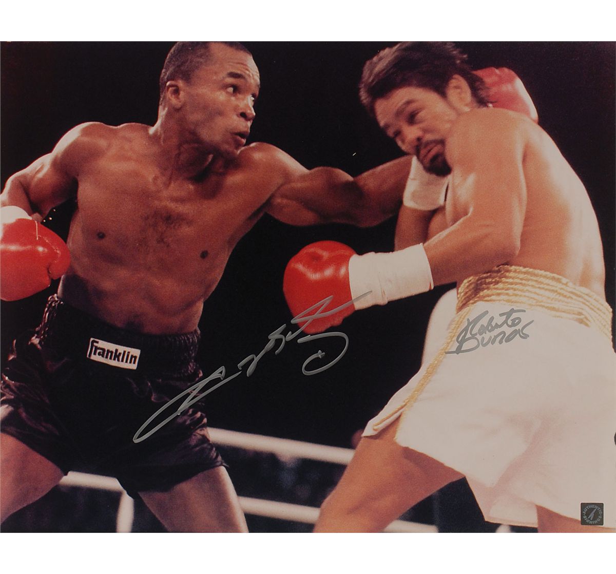 Color satin-finish 20 x 16 photo of Leonard and Duran in the ring, signed in silver ink by both. In very fine condition. Accompanied by two photos taken at time of private signing.