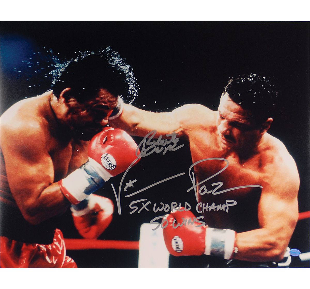 Color satin-finish 20 x 16 photo of Duran and Vinny Paz battling in the ring, signed in silver ink by Duran and Pazienza, adding “5x World Champ, 50 Wins.” In very fine condition