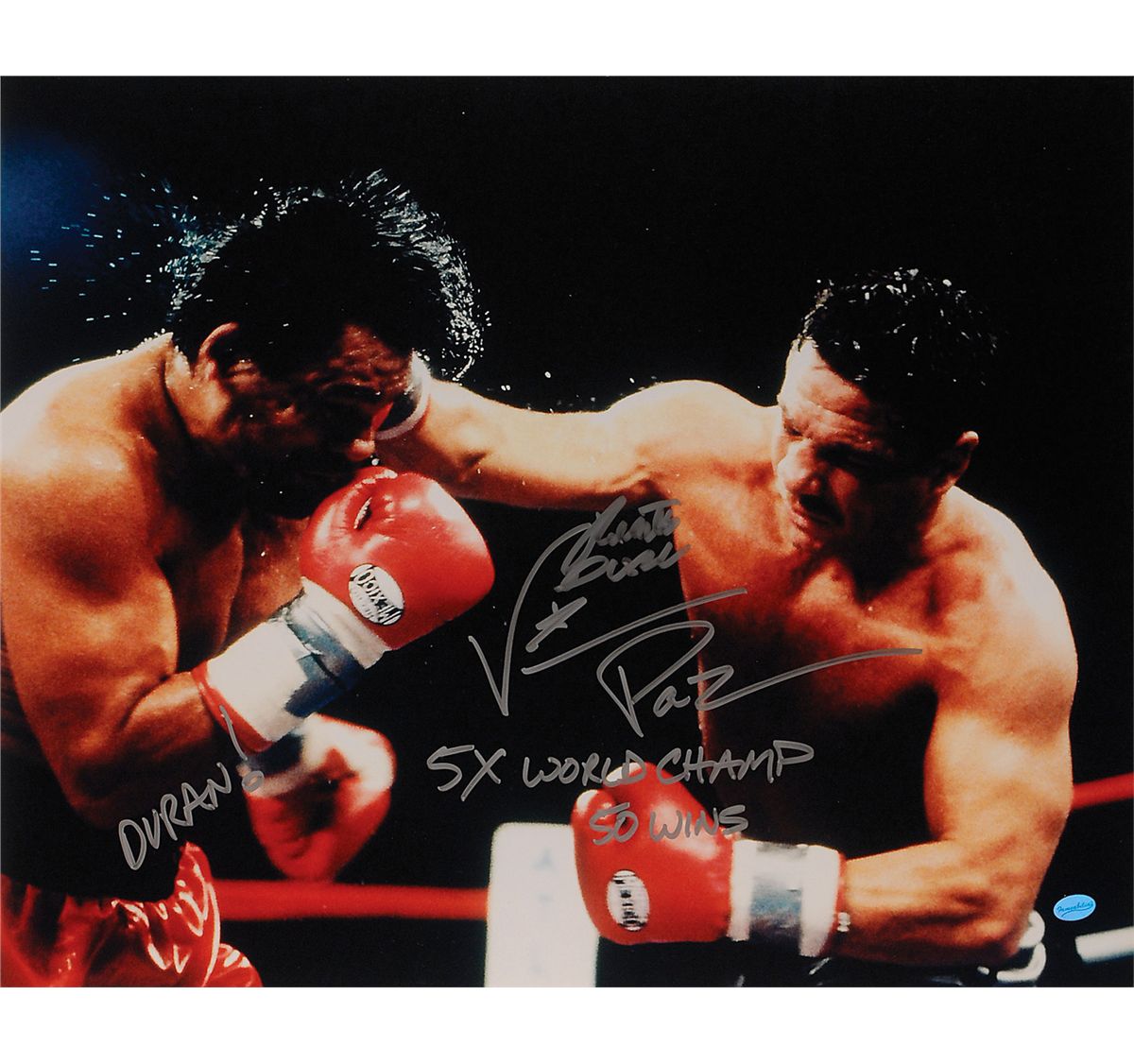 Color satin-finish 20 x 16 photo of Duran and Vinny Paz battling in the ring, signed in silver ink by Duran and Pazienza, adding “5x World Champ, 50 Wins.” In fine condition, with an authentication label affixed to lower right.