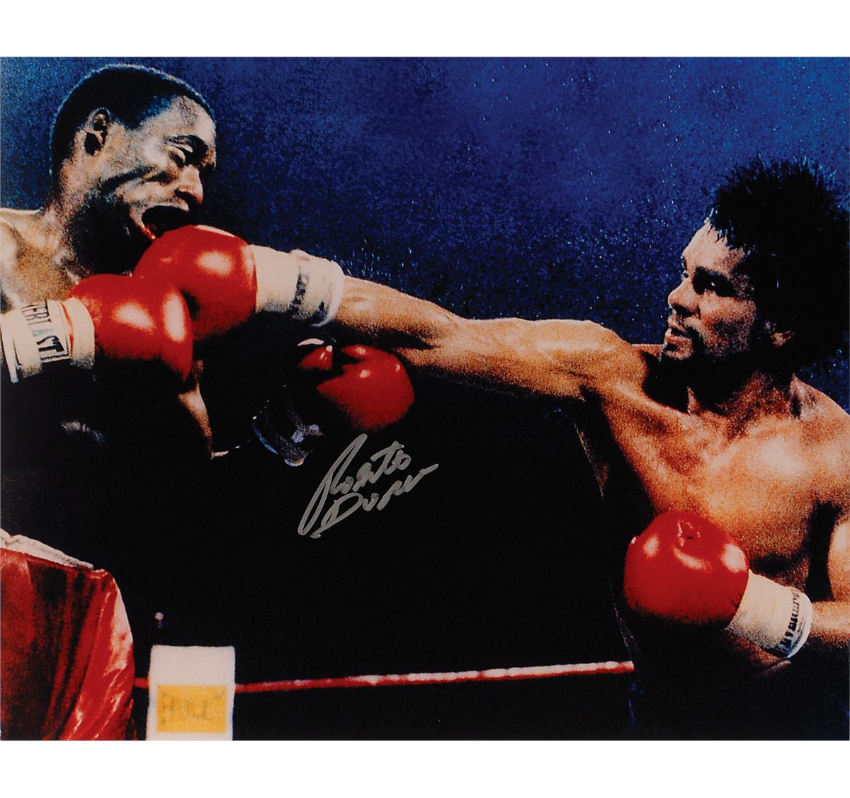 Color satin-finish 20 x 16 photo of Duran connecting with a punch to the chin of his opponent, signed in silver ink. In fine condition.