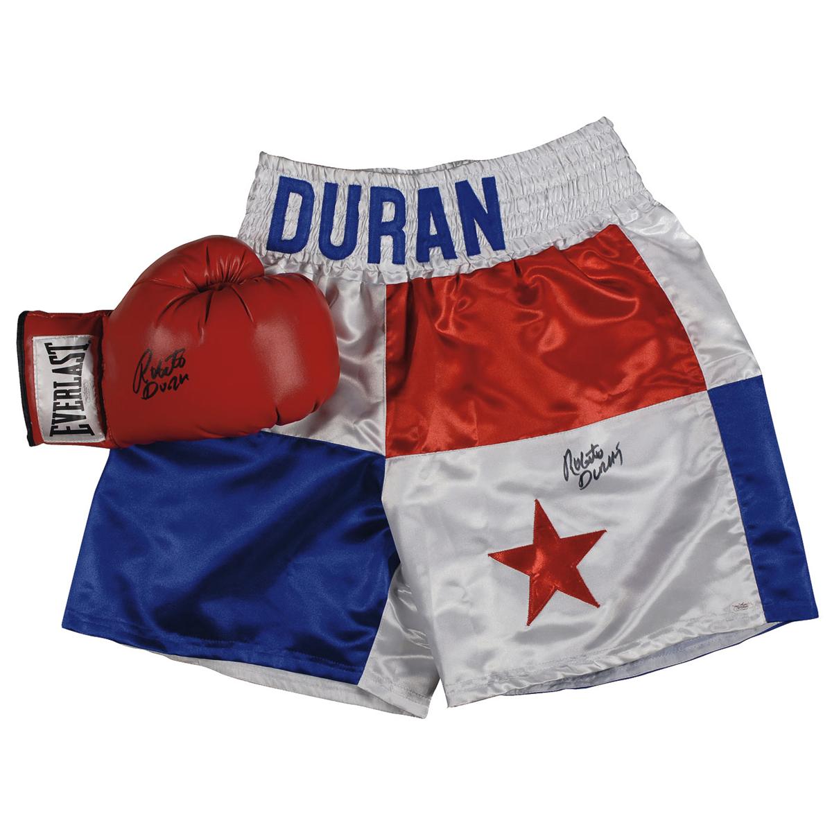 Two items: silk boxing gloves signed in black felt tip on the left thigh; and an Everlast right-handed boxing glove signed in black felt tip on the top. In very fine condition with a James Spence Authentication label affixed to each item. The trunks are accompanied by a certificate of authenticity from JSA.