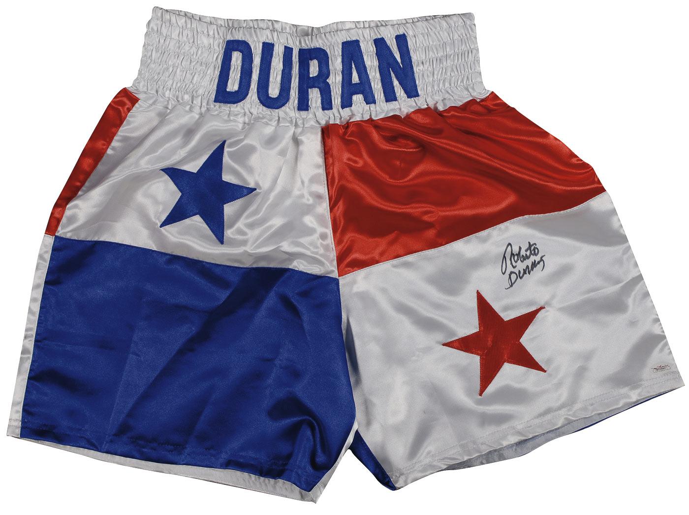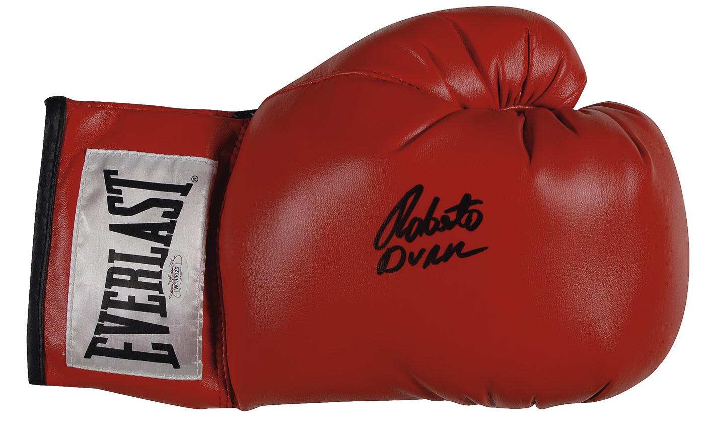 Two items: Replica silk boxing trunks signed in black felt tip, “Roberto Duran,” on the left thigh; and an Everlast right-handed boxing glove, signed in black felt tip. In very fine condition with a James Spence authentication label affixed and accompanied by a certificate of authenticity from James Spence.