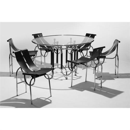 Roberto Gabetti and Aimaro Isola<BR>TRI 6 dining table and six TRI 15 chairs<BR>ARBO<BR>Italy, c. 1968<BR>chrome-plated steel, glass, mahogany, leather<BR>47.5 dia x 29.5 h inches<BR>Chairs measure: 18 w x 22 d x 29.5 h inches<BR>Literature: <BR><i>Gabetti E Isola Mobili: 1950-1970</i>, Ferrari, ppg. 73, 79<BR><BR>Condition of the item is not included in this description. Condition reports are available from Wright upon request. Wright strongly recommends that you review a condition report for each item on which you plan to bid.
