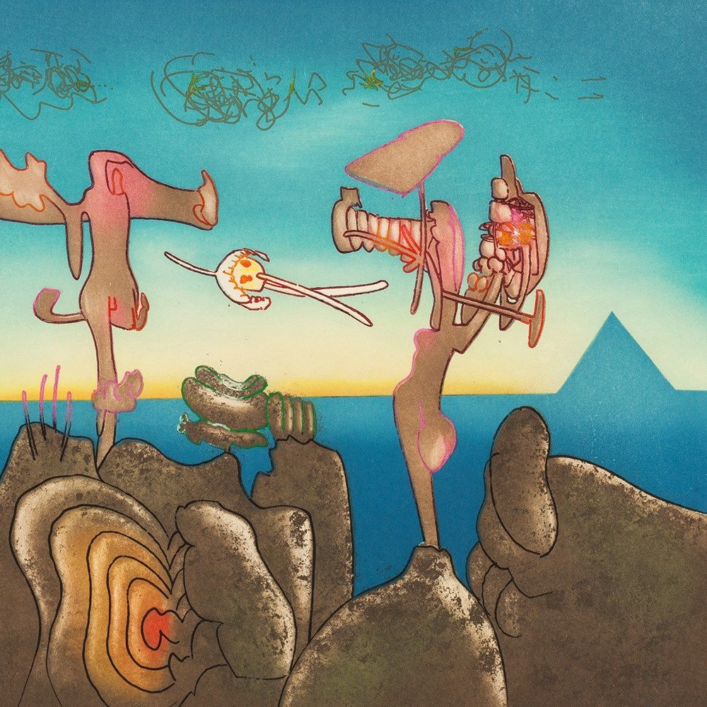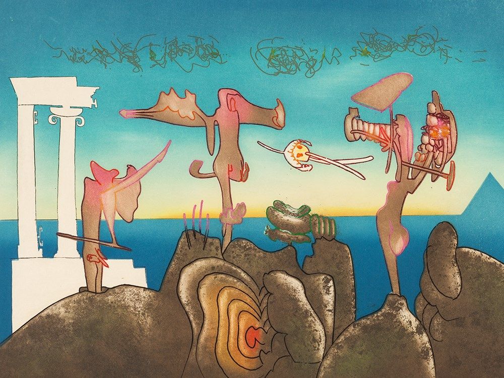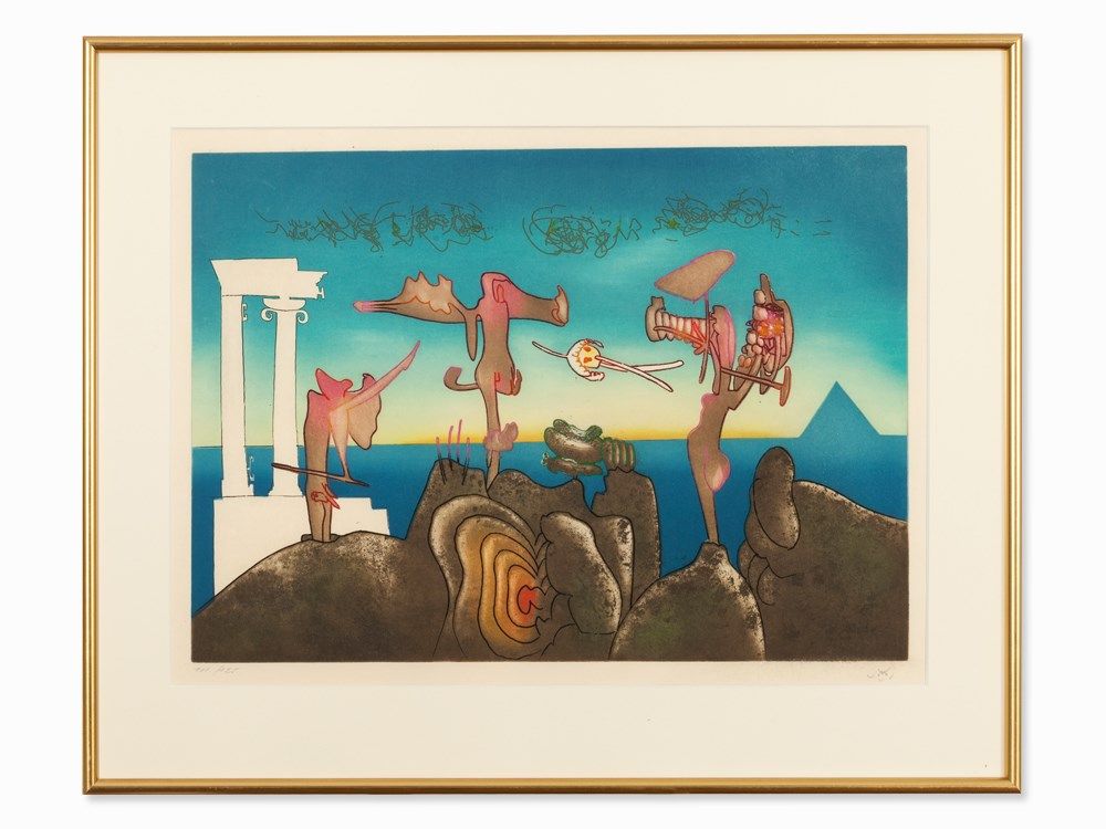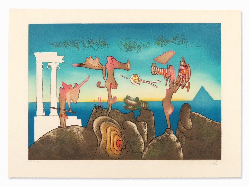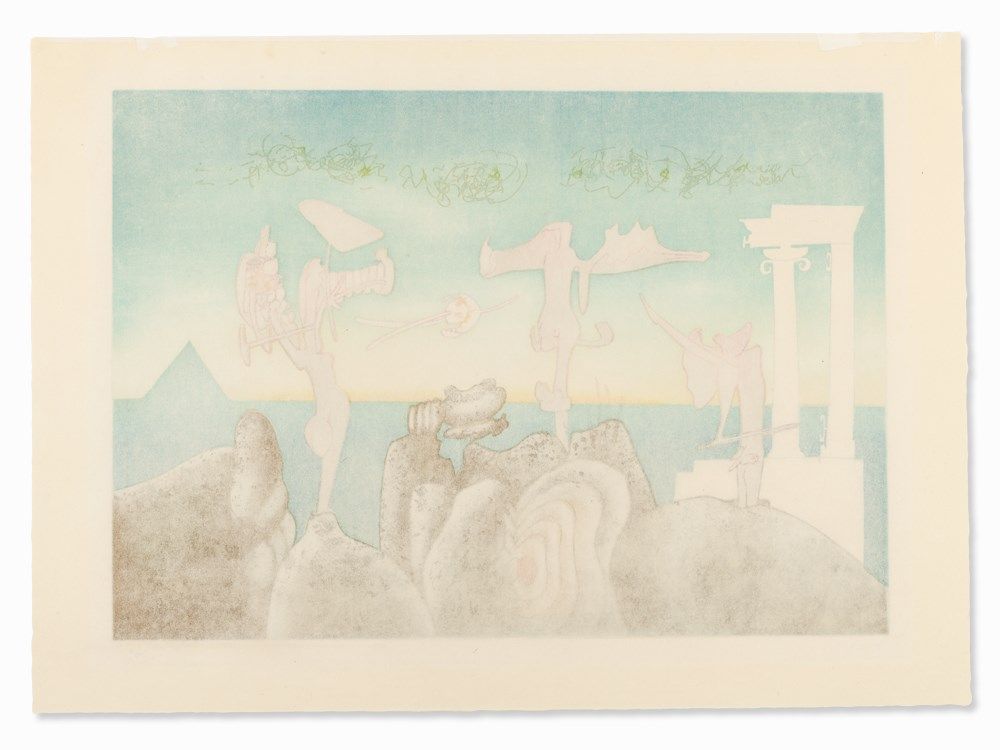 The aquatint etching presented here by Chilean artist Roberto Matta was created in 1975. It is part of a series titled ‘L'Arc obscure the heures’, including 10 aquatint etchings in colors. The image shows an antique like coastal landscape with abstract figures in front of a temple ruin, which illustrate the confrontation with the world of mythical demonic characters of ancient Mexican art, executed in Mattas distinctive, abstract surreal style.