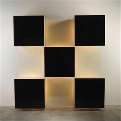 Roberto Monsani Life Collection storage wall Acerbis International Italy, 1970s lacquered board, laminate, acrylic 27.5"w x 87"h Eight upright panels and seven illuminated boxes (three panels shown), one features a drop-front door and another conceals five drawers. Labels to back on several components.