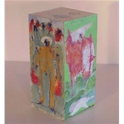 TOTEM BLOCK #3, five by five wood block painted in acrylic with crayon, 10" tall, signed. $200/400