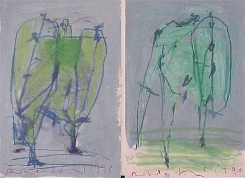 BLUE GUARDIAN ON GREEN; GREEN GUARDIAN ON BLUE, 1998, two color pastels on paper with watercolor, each 23 ½ x 15 ½”, signed and dated. (2) $100/200
