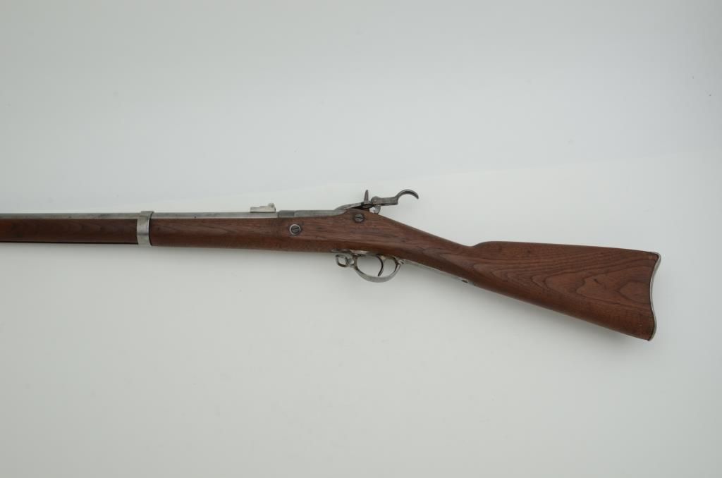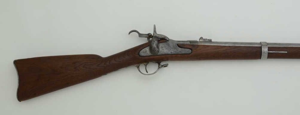 Roberts conversion of U.S. Norfolk contract percussion musket, .58 cal., 38” barrel, wood stock, ramrod missing. This gun is in overall good condition showing an old cleaning to metal surfaces of barrel that has returned to a grey patina, good action, dark bore, good stock with some scattered mars from carry and storage. From an old estate. Est.: $800-$1,600.