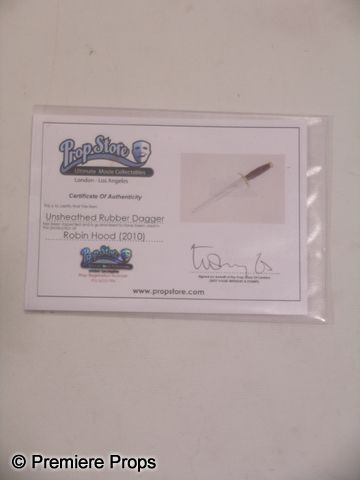 From director Ridley Scott's 2010 adventure 'Robin Hood,' starring Russell Crowe and Cate Blanchett, this is a prop dagger from the film. The dagger is made from malleable rubber and realistically painted, with tiny gold embellishments on the hand grip. Comes with COA. (measures approx. 13" long)