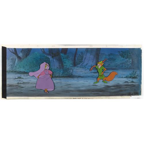 <B>"Robin Hood" Animation Production Cels and Background Original Art (Walt Disney, 1973).</B></I> Beautiful pan production setup of the woods with the matching cel of Maid Marian dancing, with an accompanying production cel of Robin. Size is 32" x 12". Excellent condition.<BR><BR><b>Shipping:</b> Flat Material, Large (<a target="_blank" href="http://www.heritageauctions.com/common/shipping.php">view shipping information</a>)
