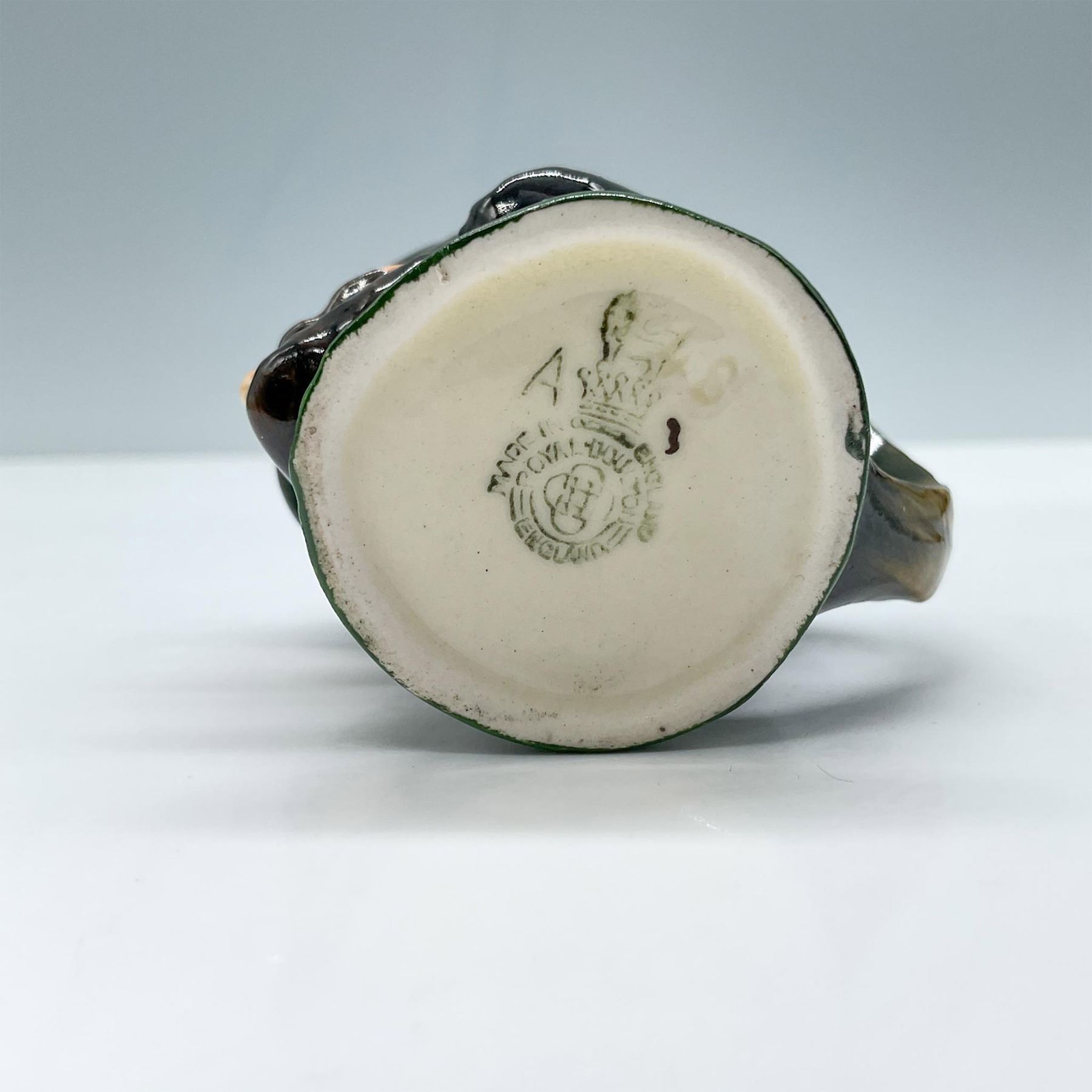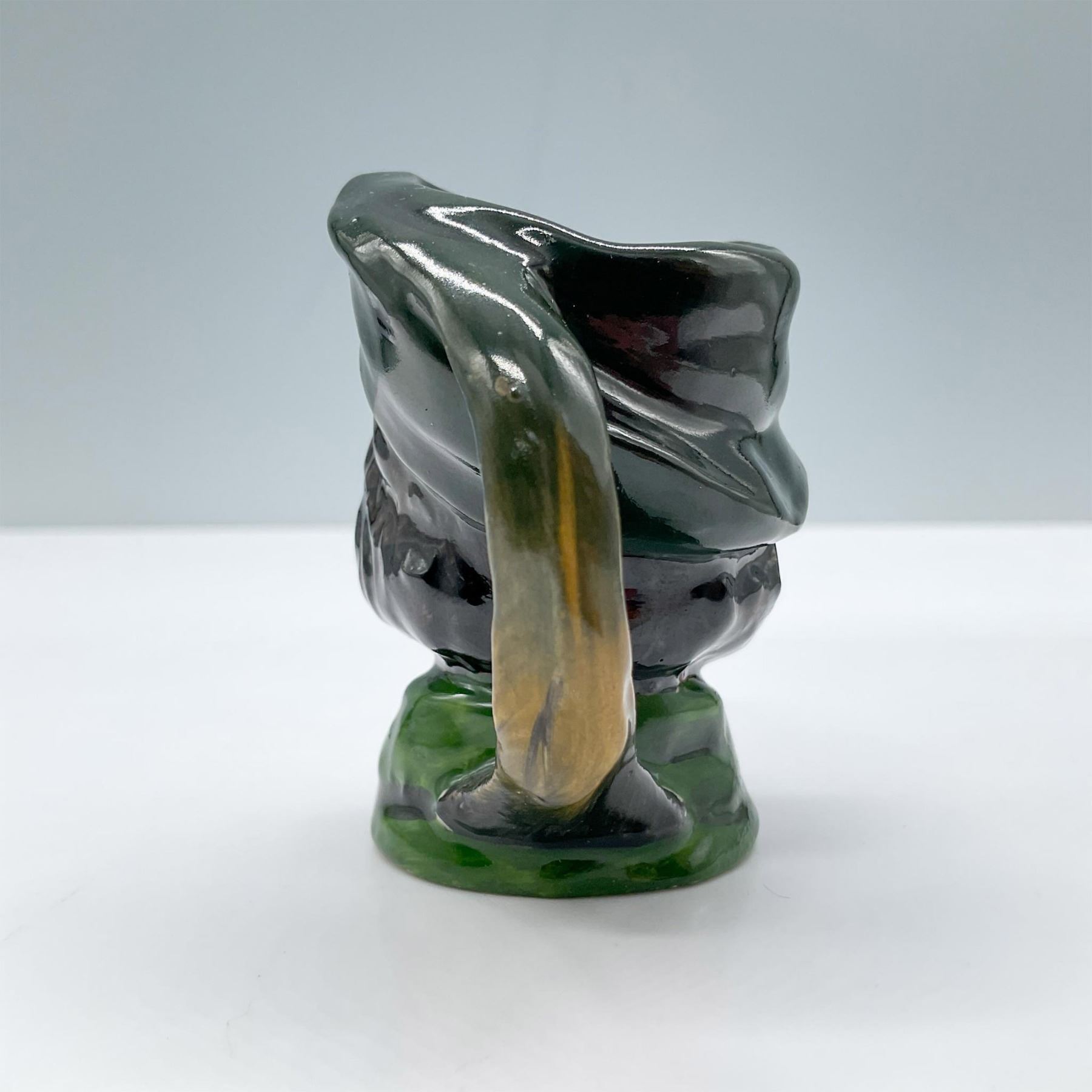 Figural jug of the English heroic outlaw with dark brown, almost black, facial hair. In a green tunic, and a dark green hat. The hat feather, as the handle, changes from green to yellow to black as it reaches the base. Royal Doulton backstamp.