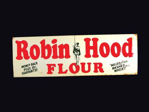 Robin Hood Flour Embossed Tin Sign, 1951. Rust on right and bottom otherwise very good condition. 35 1/2 X 11 1/2 inches.