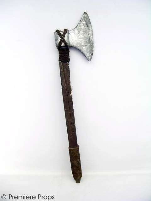 Broken battle axe - Fiber glass like axe head, wood handle / Rope tied around handle and axe head (*Large break runs down entire handle, barely stays in one piece / Axe blade is chipped / Dirty) Approx. 31" x 7.75"