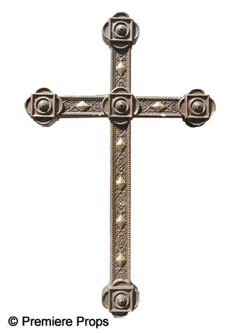 Robin Hood: Prince of Thieves (1996) - This is the decorative cross used by Robin Hood (Kevin Costner) to deflect an attack by the sheriff. The two hits can still be seen on the cross where it was struck during production of the movie. This is a brown with gold accents, gold rhinestone design, etching, hard plastic and wood, with metal support on the back, large cross. (approx. 64" x 40"). Another unique piece of Robin Hood memorabilia! This item is oversized and requires additional shipping charges. Please email for shipping rates prior to bidding. (EA3008)