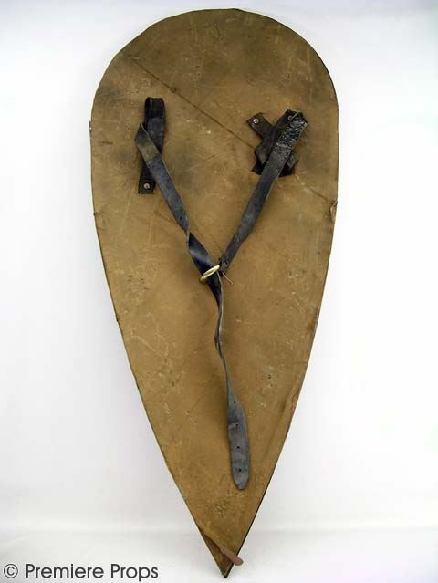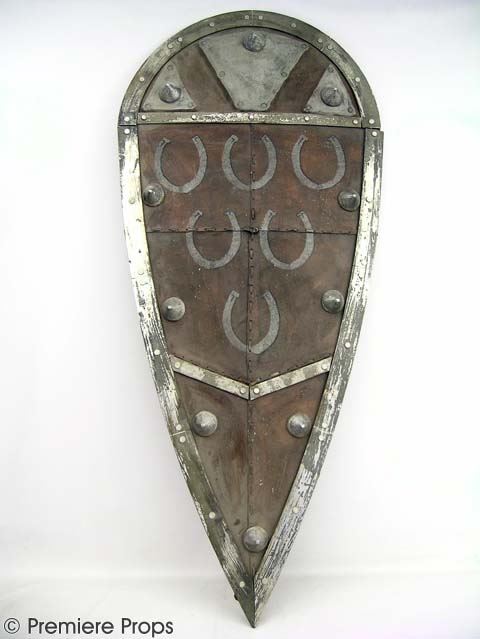 Shield - Metal / Brown shield with horse shoe design and leather like covering and strap / handle. (* Leather like covering is peeling off backside / Dirty) Approx. 52.5" x 23"