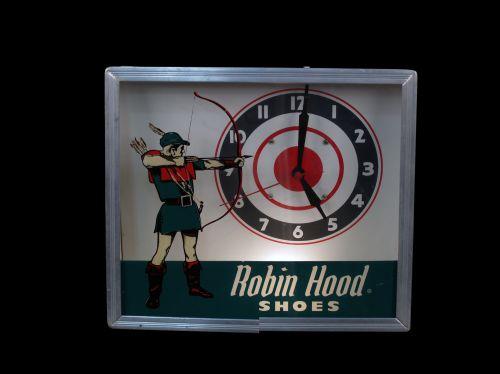 "Robin Hood Shoes" lite-up square clock depicts Robin Hood & Bullseye 12 x 14