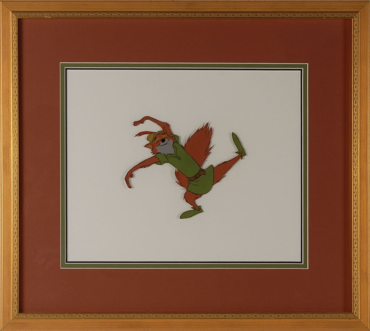 (Walt Disney Studios, 1973) Original production cel featuring Robin Hood from Robin Hood, showing the happy-go-lucky thief swaying with his arms in the air. Image measures 6.75 x 5.75, with a mat opening of 12.5 x 10. This piece is also framed to an overall size of 20 x 18. In fine condition.