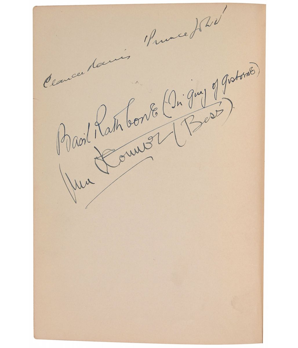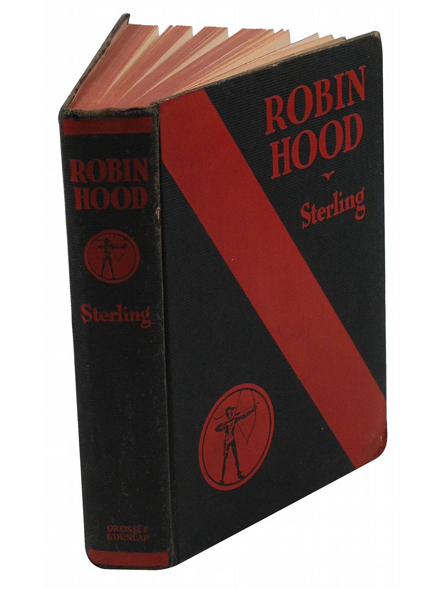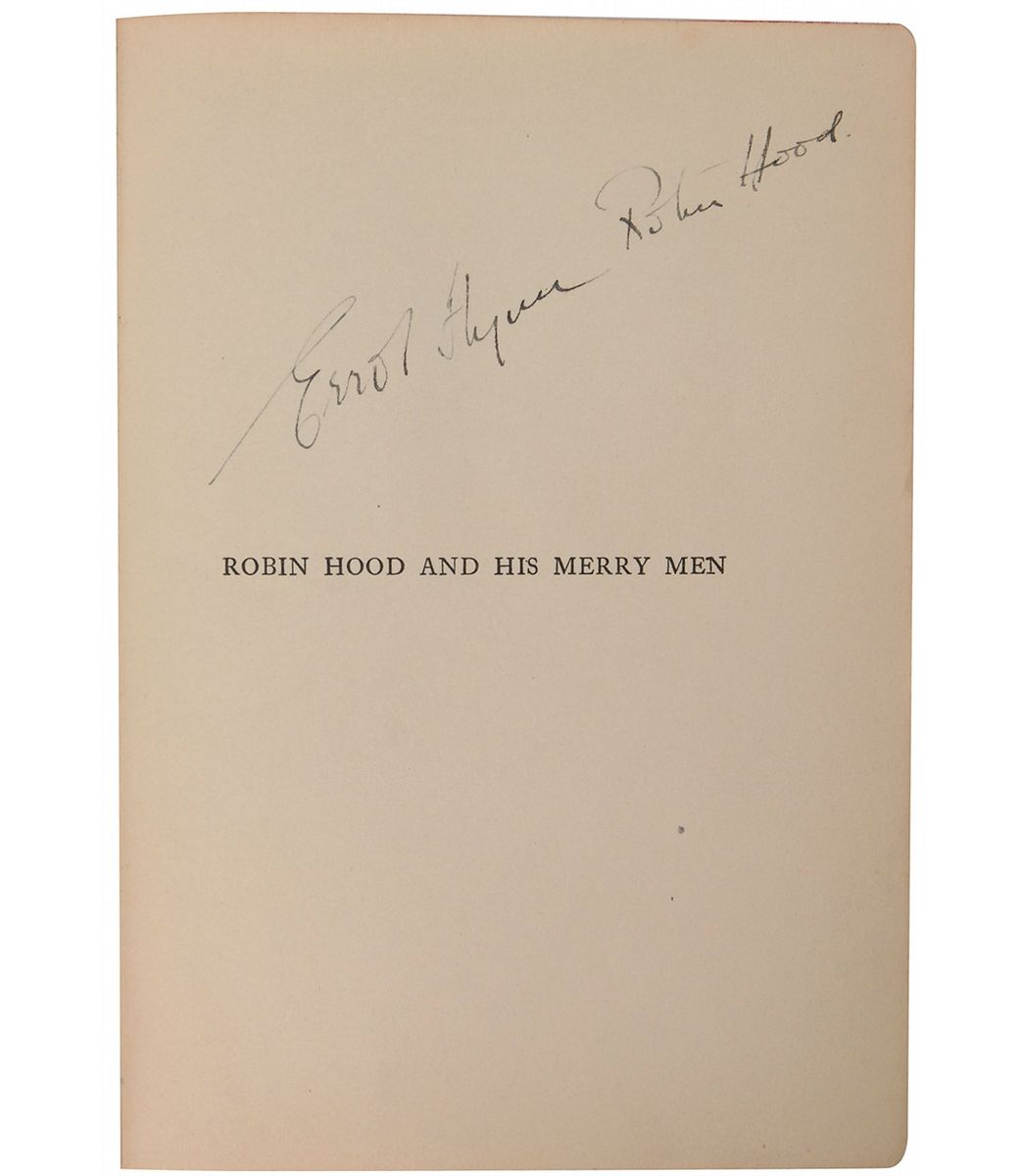 Signed book: Robin Hood and His Merry Men. NY: Grosset & Dunlap, 1921. Hardcover, 6.25 x 8.5, 360 pages. Signed inside in fountain pen by the cast of the 1938 swashbuckler film The Adventures of Robin Hood, each including their character’s name: “Errol Flynn, Robin Hood,” “Basil Rathbone (Sir Guy of Gisborne),” “Claude Rains, ‘Prince John,’” and “Una O’Connor (Bess).” Also signed and inscribed on the dedication page, “To Merel, Al Alleborn.” Autographic condition: fine. Book condition: G+/None. Black cloth-covered boards; edges heavily worn, with several tears in cloth; large abrasion to rear lower edge, with cloth and portion of board missing; shelf-cocked; sunning and light insect damage to spine; textblock yellowed; faint smoky smell. The original recipient obtained the signatures on set when Alleborn, a family friend and the unit production manager for the film, took her to visit the studio. An outstanding piece straight from the set of the tremendously popular, Academy Award–winning movie.