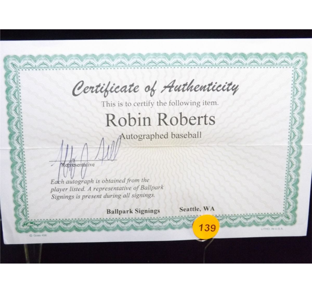 Robin Roberts Autographed 1976 HoF Baseball. Rawlings Offical NLB. Appraised or estimated retail value $500. COA by Ballpark Signings. All Sales Final. Please see terms and conditions of auction.