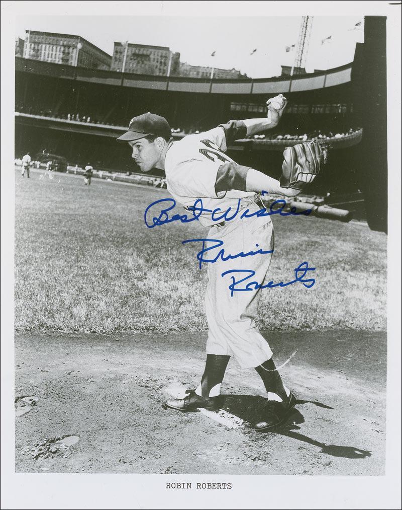 Glossy 8 x 10 photo of Roberts warming up before a game, signed in blue felt tip, “Best wishes, Robin Roberts.” In fine condition, with some scattered light corner creases.