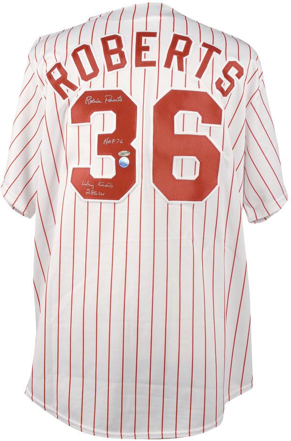Official Majestic replica Philadelphia Phillies baseball jersey, with sewn on letters and numbers, signed in silver ink on the number on the back, “Robin Roberts, HOF 76, Whiz Kids, 286W.” In fine condition.