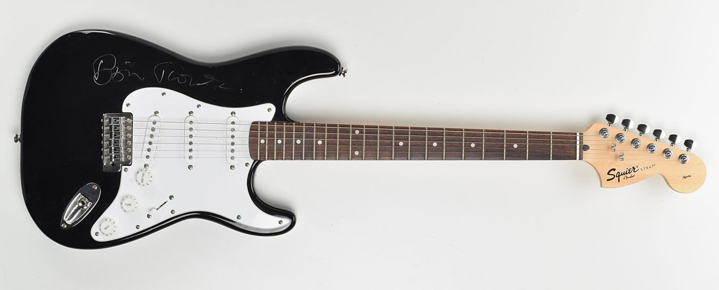 Black-bodied Affinity series Fender Squier Stratocaster electric guitar, signed on the body in silver ink by Robin Trower. In fine condition, with some light wear to the body, and the signature a shade light.