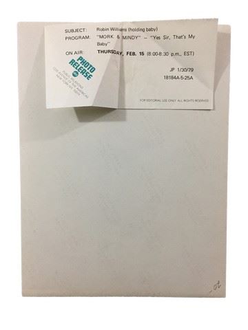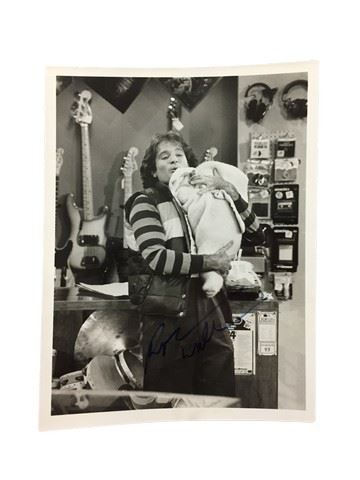 An autographed black and white glossy photo of actor commedian Robin Williams from his award winning TV show "Mork and Mindy" ca. 1979. The condition is good with minor pencil markings and smudges. Verso is press information about the epidsode depicted in the photo. The photo is in good condition. There are a few pencil markeings (Approx. 7 x 9 in.)