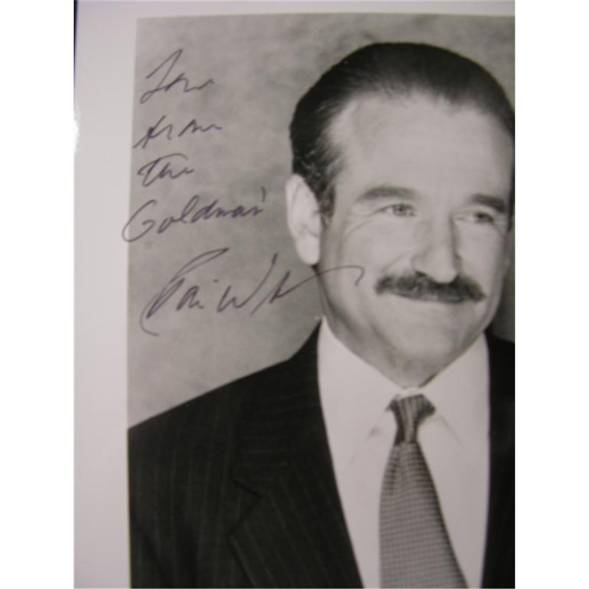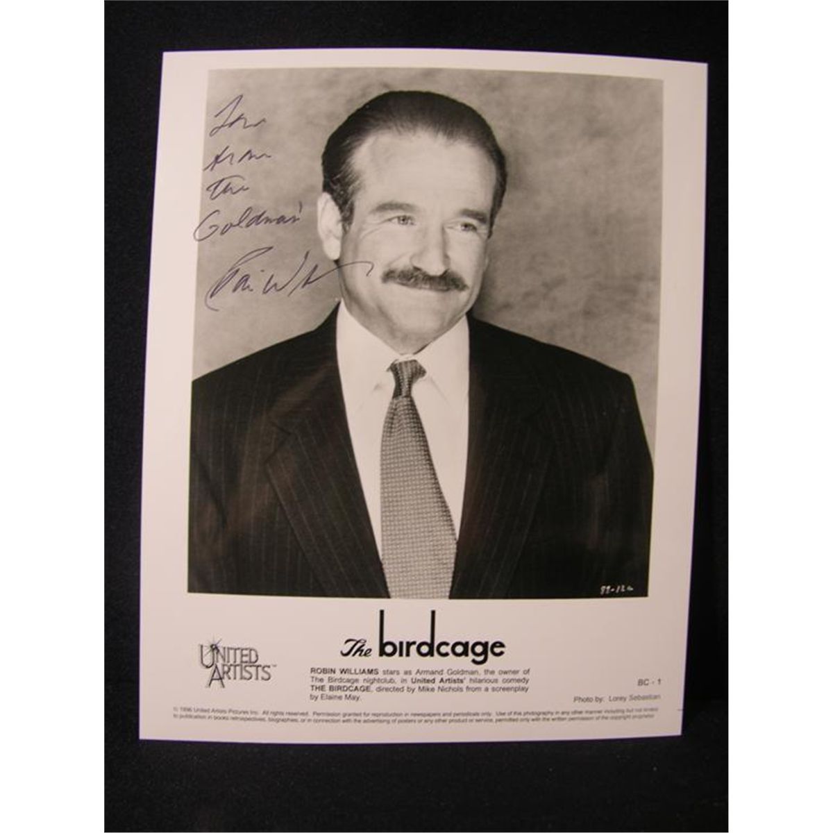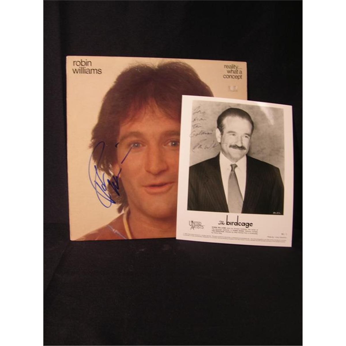 Robin Williams signed LP and photo, being an original release of Williams' 1979 album Reality…What a Concept and a black and white photo of the actor in The Birdcage (1996). The photo has been inscribed "Love from the Goldmans!" (Photo 8x10, Record 12.5x12.5)