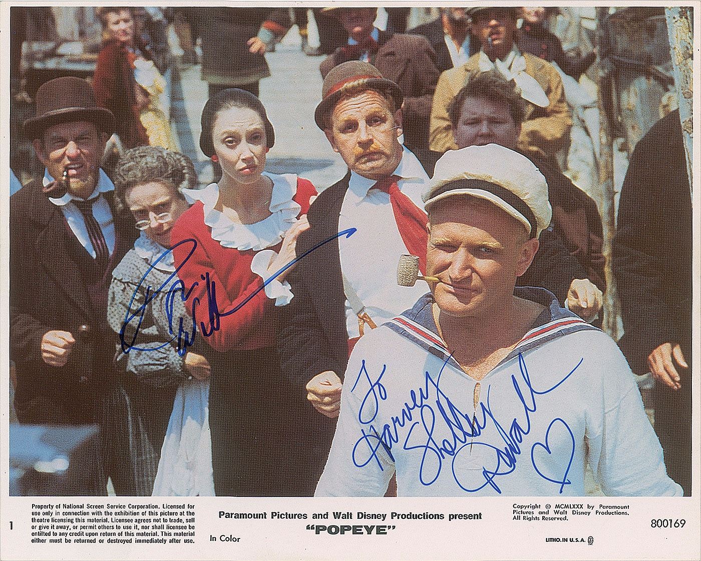 Color 10 x 8 cardstock photo for the 1980 live-action Popeye movie, signed and inscribed in blue felt tip, "Robin Williams" and "To Harvey, Shelley Duvall.” In fine condition. From the Harvey and Rhoda Kuflik Collection.
