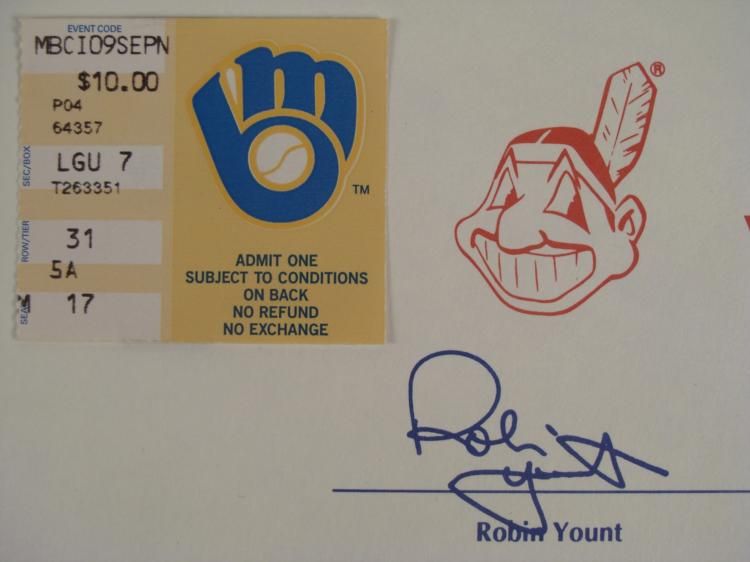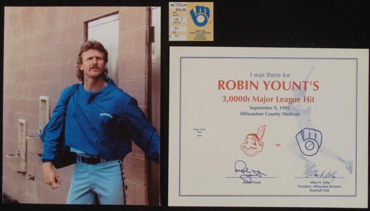 Come and celebrate Major League Baseball history with this 8x10 photograph of Hall of Famer Robin Yount. He is leaving the locker room with warm-up coat on and a small duffle bag on his shoulder. Robin Yount is now apart of Major League Baseballs history by recording 3,000+ hits in his career with the Milwaukee Brewers. He recorded his 3000 hit on September 9th, 1992 against the Cleveland Indians in Milwaukee County Stadium. The photo comes with a commemorative certificate signed by both Robin Yount and Milwaukee Brewers president Allan H. Selig. The photo comes with a ticket stub from that historic game. * Always a better-than-average hitter (career .285 batting average), by 1980 Yount had developed into a power-hitting shortstop. An All-Star in 1980, 1982 and 1983, Yount collected more hits in the decade of the 1980s than any other player (1731) and won a Gold Glove Award in 1982. 1982 proved his finest statistical season, as he won his first MVP award and helped lead the Brewers to their only World Series appearance, where he became the only player to collect four hits in each of two World Series games. His career highs of 29 home runs, a .331 batting average, and 114 RBIs were all products of the 1982 season; he also stole 14 bases and had 210 hits, of which 46 were doubles and 12 were triples. *