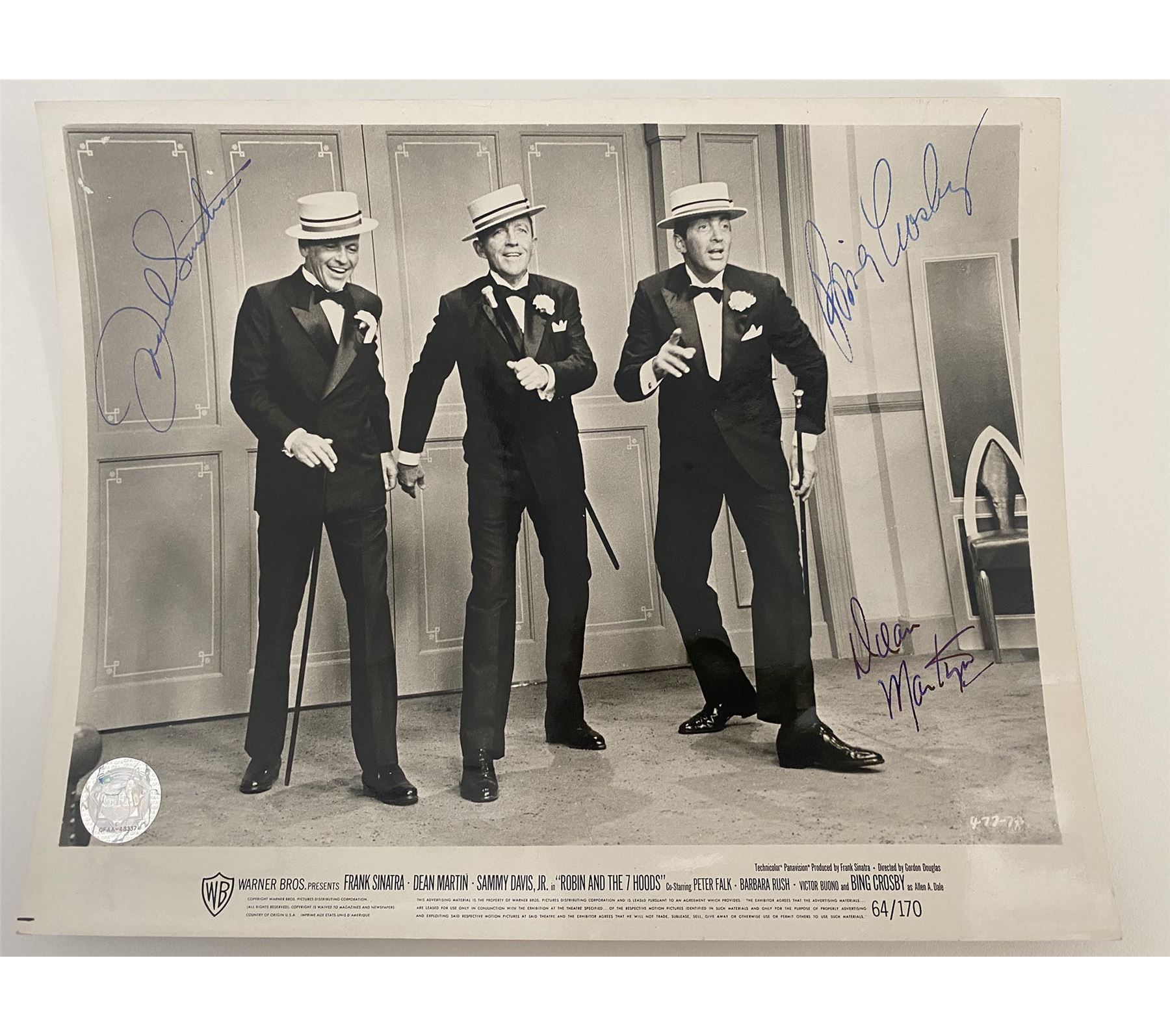 Robin and the 7 Hoods cast signed movie photo autographed by Frank Sinatra, Dean Martin, and Bing Crosby. GFA authenticated. 10x8 inches