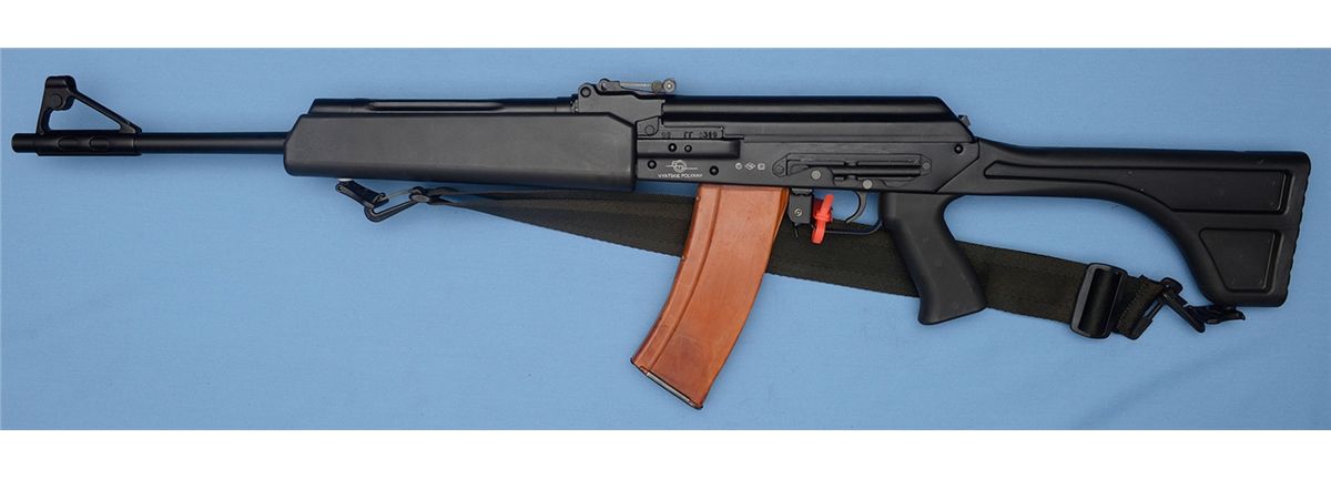 With one Russian orange AKM 30 round magazine and a black nylon sling.