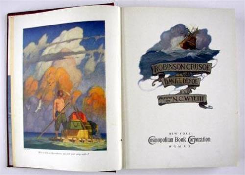 Robinson Crusoe, by Daniel Defoe, illustrated by N.C. Wyeth, published by Cosmopolitan Book Corporation of New York, 1920, from the Estate of Charles Bunnell, Condition:Very Good: slight cover wear, name written inside, small 1" decal stuck on inside page, no dust jacket