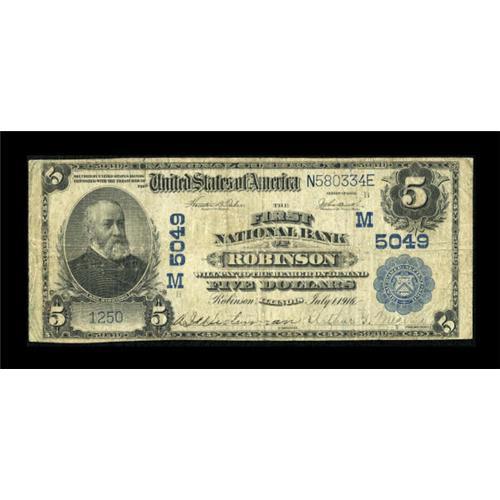 <B>Robinson, IL</B></I> - $5 1902 Plain Back Fr. 606 <B>The First NB</B></I> Ch. # (M)5049<BR> A very scarce note from a bank with just $830 outstanding in large size at the time of the bank's closing in 1932. Wonderful pen signatures grace the front on this evenly circulated note. <B>Very Good</B></I>.<BR><BR><b>Shipping:</b> Coins & Currency (<a target="_blank" href="http://www.heritageauctions.com/common/shipping.php">view shipping information</a>)